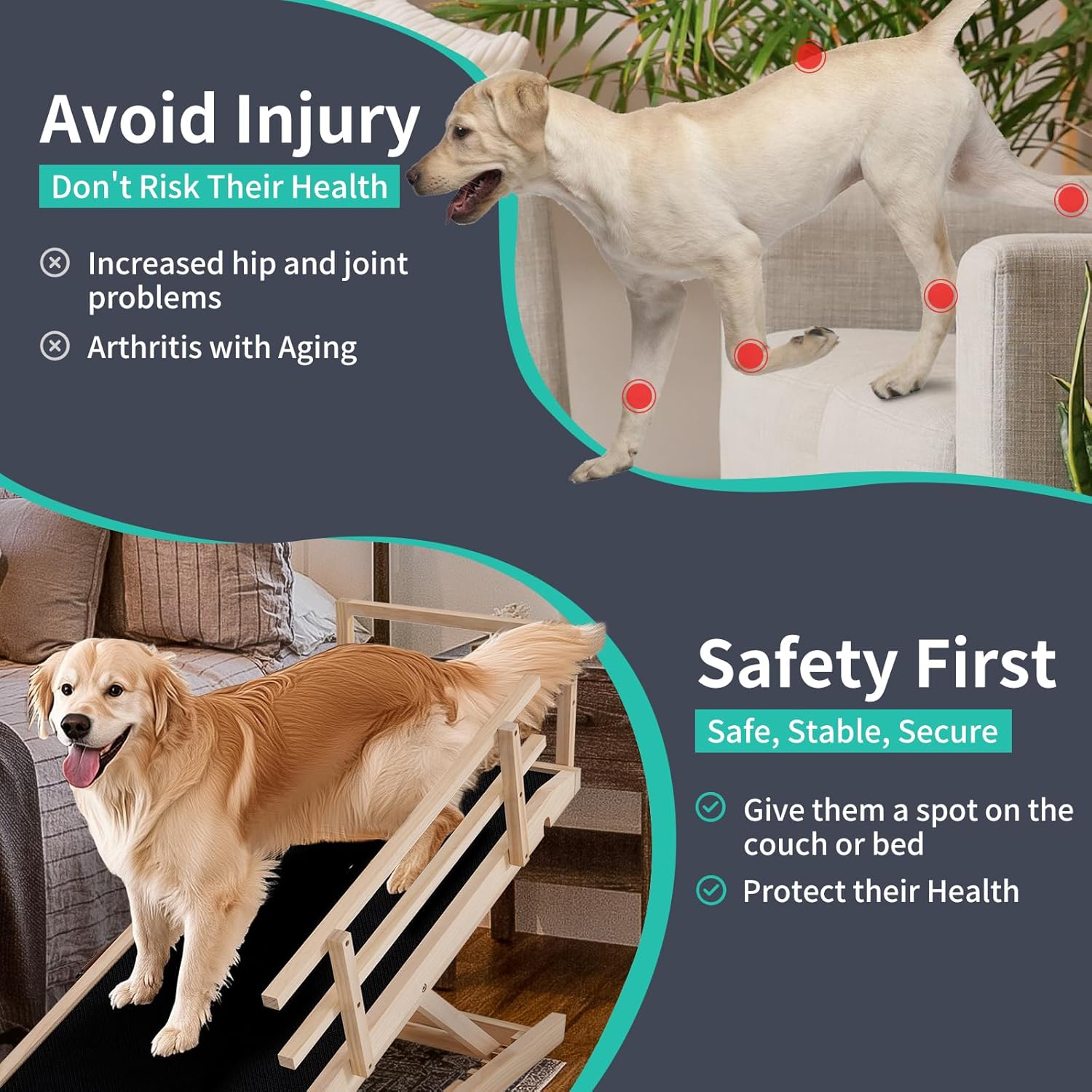 - STURDY & DURABLE: Our pet ramp for dogs and cats is specially made very well - solid wood construction and sturdy stainless steel fasteners, which has been tested to support up to 200lbs. When they jump off the bed, sofa, and sofa, there is no need to worry about getting injured, which provides safety for your pet.