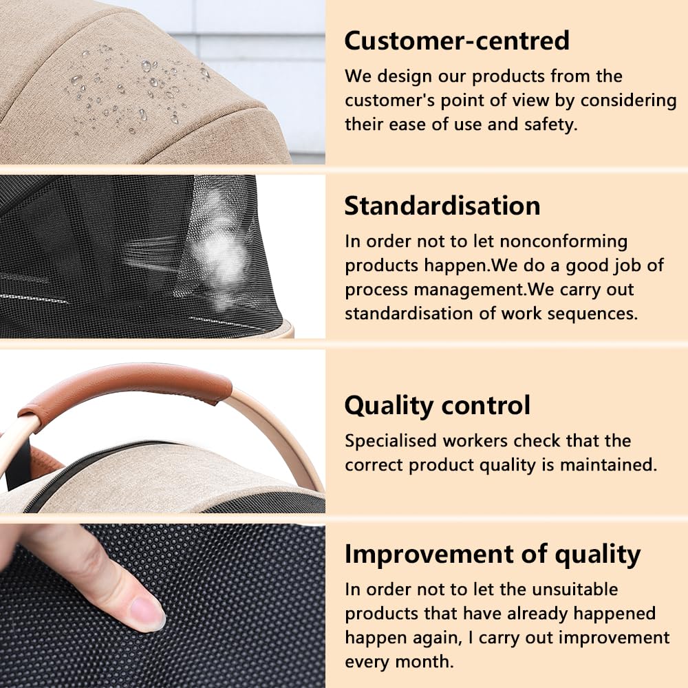 - SAFETY AND RELIABILITY: The four wheels are made of durable PU material to suit all occasions. The pushchair has large wheels and the front wheels can swivel 360Β°, these wheels not only ensure durability but also provide smooth and quiet operation. Whether you are walking on the sidewalk or on rough ground, our pet stroller will provide a comfortable and pleasant experience for your pet.