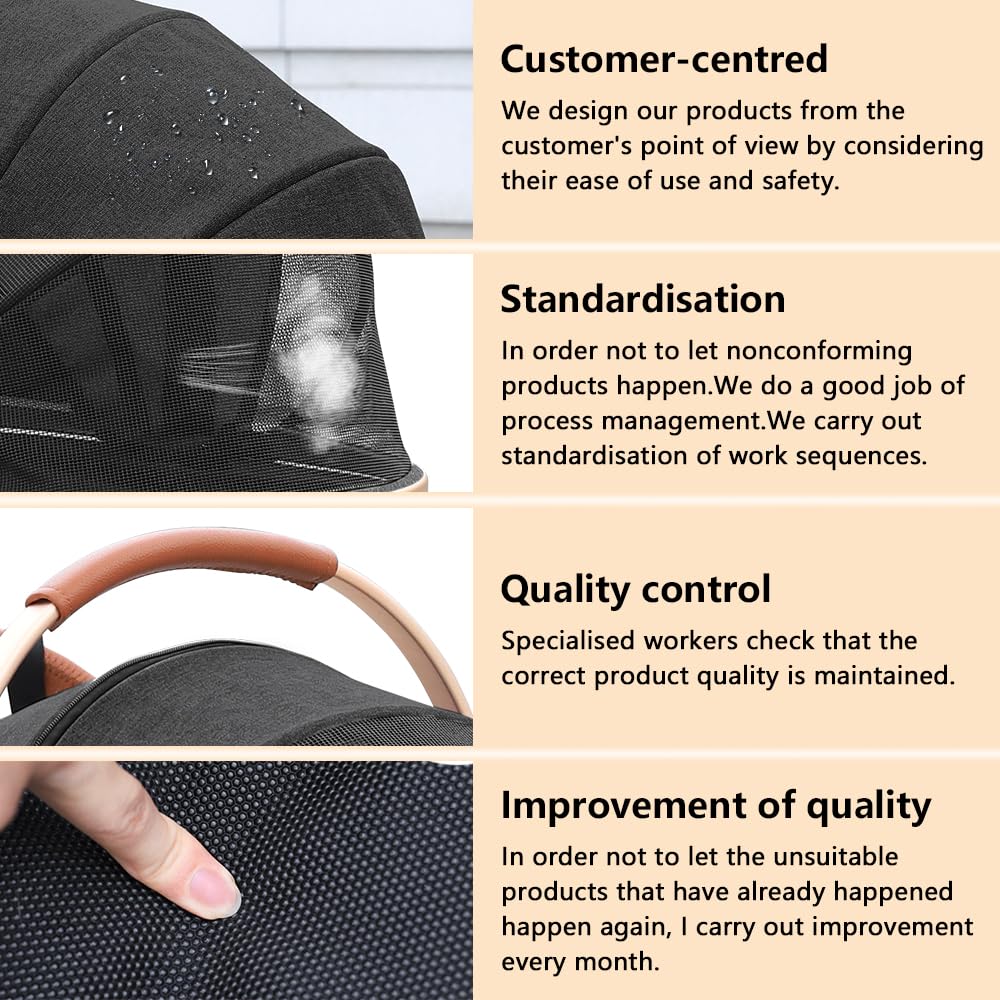 - SAFETY AND RELIABILITY: The four wheels are made of durable PU material to suit all occasions. The pushchair has large wheels and the front wheels can swivel 360Β°, these wheels not only ensure durability but also provide smooth and quiet operation. Whether you are walking on the sidewalk or on rough ground, our pet stroller will provide a comfortable and pleasant experience for your pet.