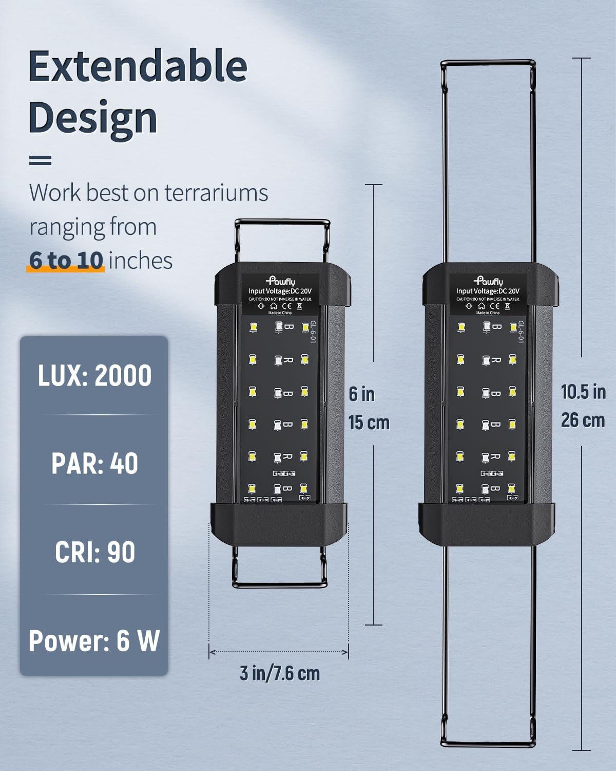 - For 6" to 10" Terrariums: With an extendable bracket (min length: up to 6"; max length: up to 10.5"), the reptile LED light always stays steady on the tank. Work best on reptile tanks of 6 to 10 inches long