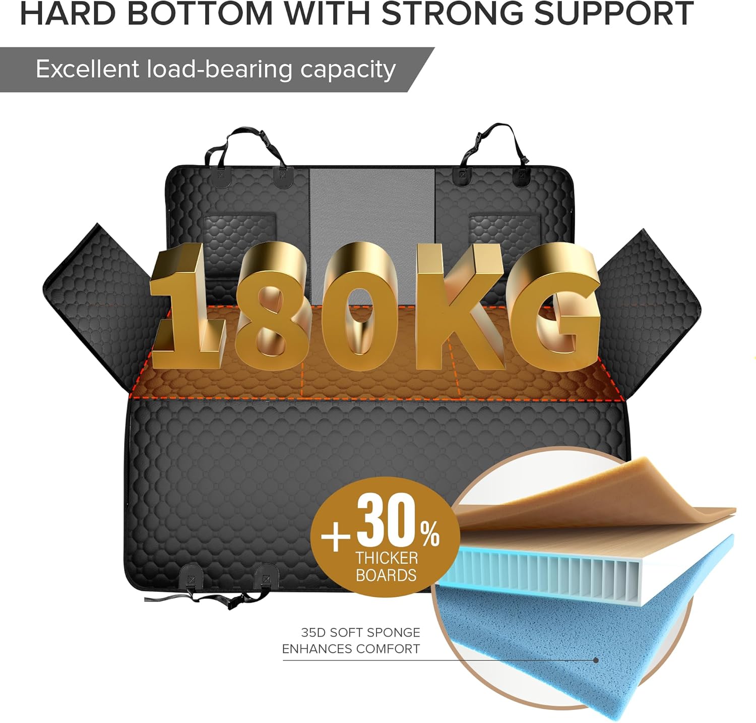 - 40% Space Expand with hard bottom car seat cover for dogs - Maximize vehicle's rear seating area with pet seat covers for trucks, featuring built-in extender board adds extra 40% of coverage. It seamlessly integrates with the backseat, providing flat and secure surface that prevents pet from sliding off the seat. Robust load capacity is designed to support up to 550lbs, this dog backseat extender hard bottom is perfect for larger dogs or for when you need to transport multiple pets at once