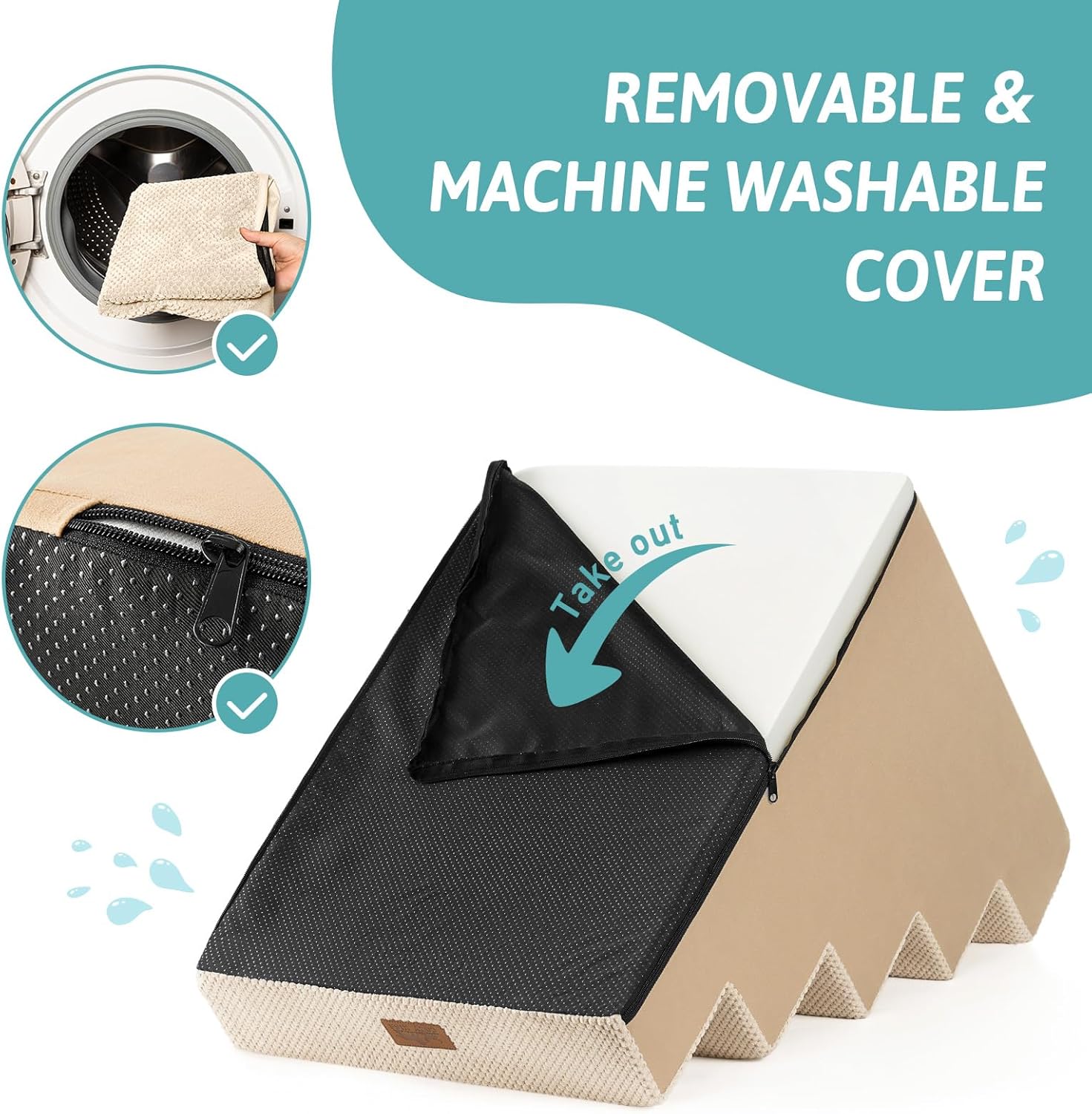 - Non-Slip Base and Removable Cover: Our dog steps for beds are equipped with a non-slip base featuring rubber dots for additional grip, minimizing movement during use. The pet steps cover is waterproof on the inner side, so you donโt have to worry about stains seeping into the foam. The outer cover is removable and machine washable for easy cleaning