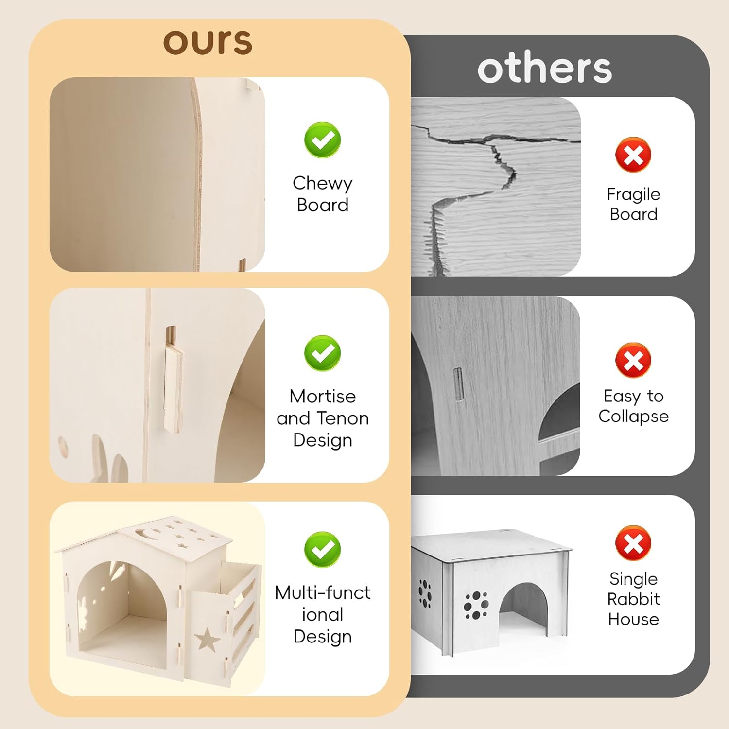- 【Premium Materials】The bunny houses is made of poplar plywood. It is a safe and harmless material that processed from natural wood. Providing a healthy and cozy environment for your bunny to explore and rest.