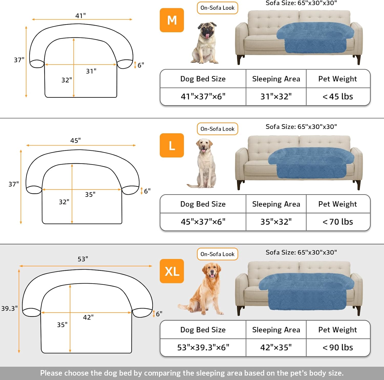 - 【Multiple Size Selection】The couch pet bed has 5 sizes for you to choose from. M: 41"x37" dog bed for medium dogs. L: 45"x37" dog bed for large dogs. XL: 53"x39.3" dog bed for large dogs. We have enlarged the sleeping area for pets to give dogs more space.