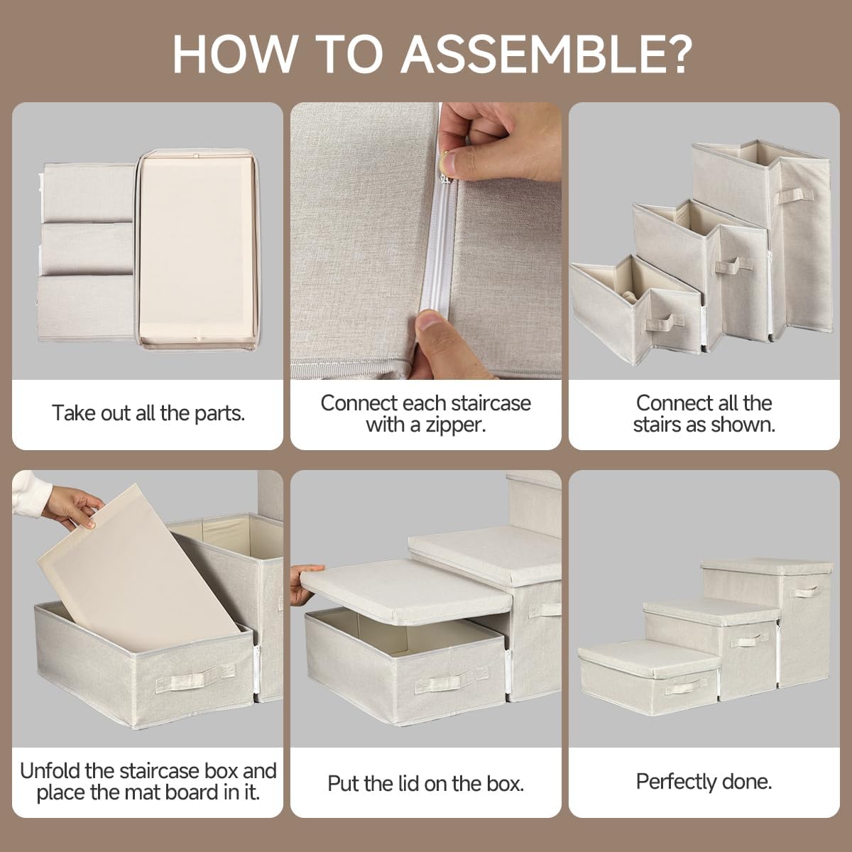 - Easy to Assemble: First, you need to attach the zipper of each step, then open each step completely, put each support board into the corresponding storage box, and finally close the lid. When not needed, remove the lid and fold it completely so you can easily move, transfer and store it. This saves space and is suitable for small rooms
