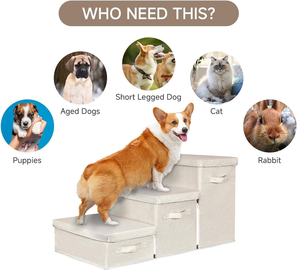 Pet Stairs with Storage, Pet Step for Small Dogs and Cats, 3-Step Folding Pet Steps with Zip, Cat Stairs Dog Steps for Bed, Couch and Car Ramp (Beige, 3 Steps no Condo)