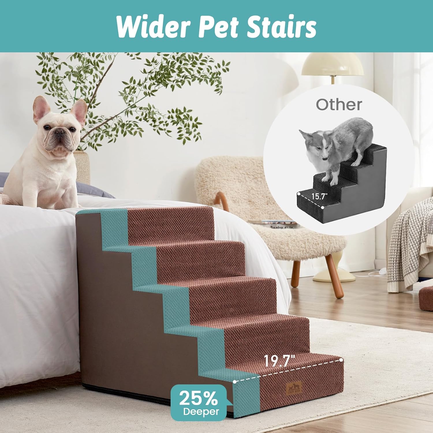- Widened Pet Stairs: The dog steps feature a widened design 4 inches broader than standard dog stairs, offering enhanced stability while accommodating the needs of small and medium dogs, the extra width provides a safer climbing space for pets. With 5 tiers of height, it allows your pet to reach elevated areas easily