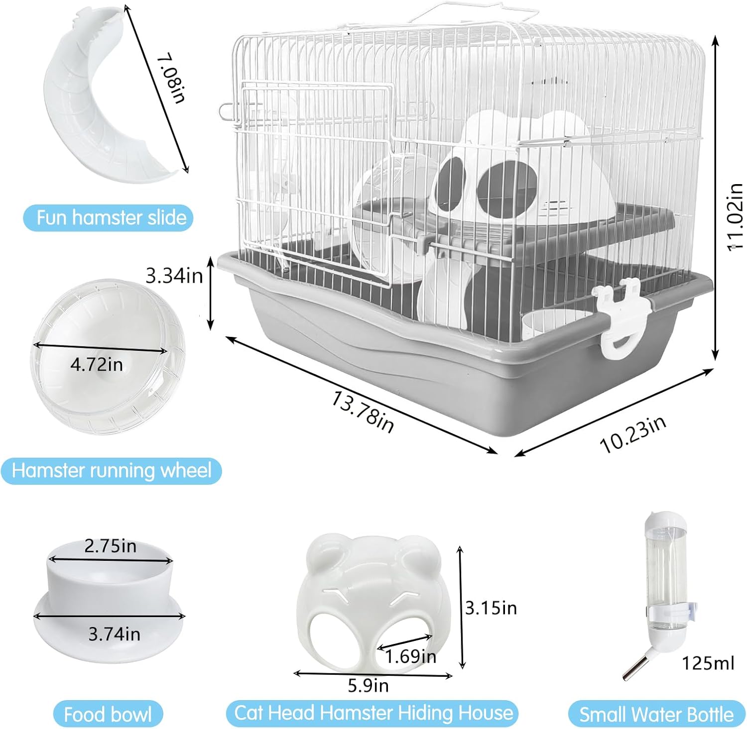 - Hamster cage: Set includes mice cage*1, castle house*1, 2nd floor platform*1, slide*1, running wheel*1, water bottle*1, food bowl*1. The hamster cage has a sturdy structure, which allows you to ventilate the cage and see your pet's activities
