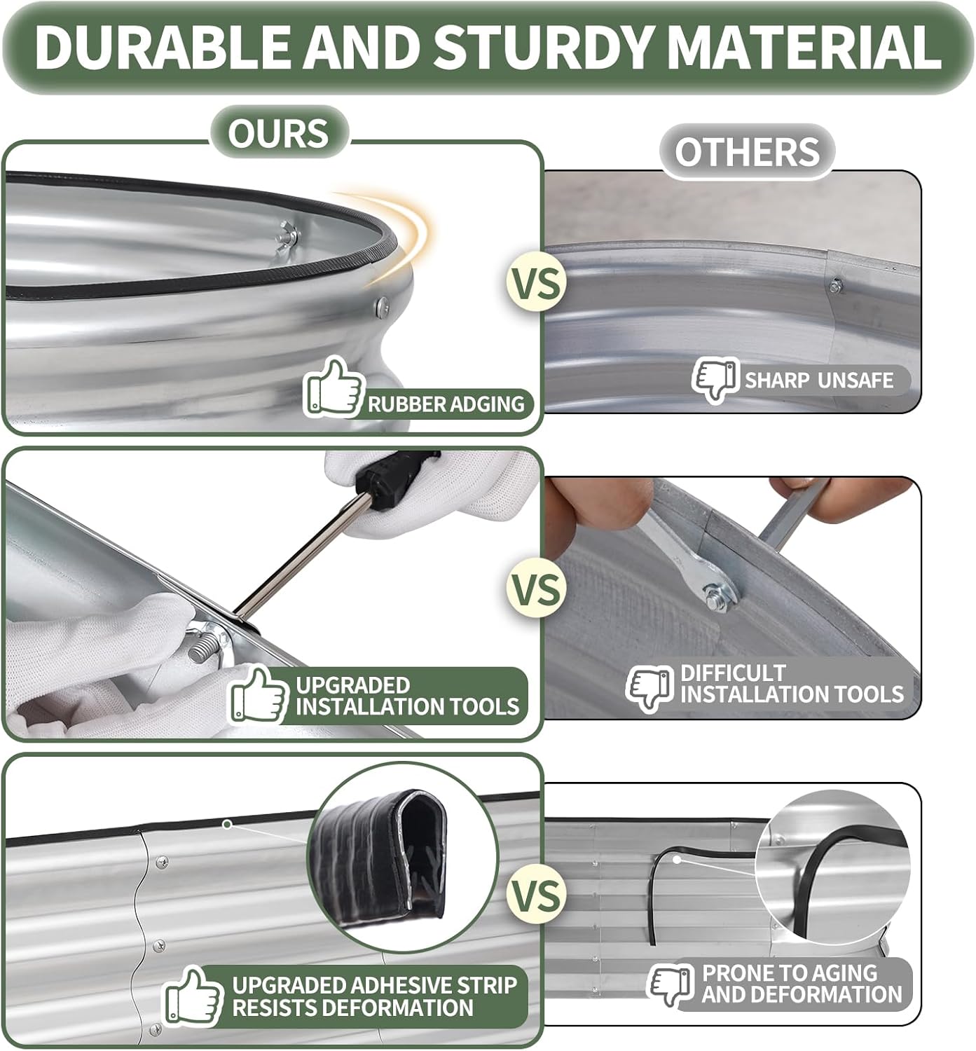 - 【Safety Edge Design & Durable Rubber Strips】The garden bed's top and bottom edges are folded to eliminate sharp edges, ensuring safety from all sides. Rubber strips add extra protection and cushioning, with built-in patches for durability. The galvanized planting box offers the perfect solution for creating your ideal vegetable garden. With the 1More raised bed, enjoy a worry-free gardening experience, prioritizing your safety and convenience. The ultimate choice for a hassle-free and enjoyable gardening experience