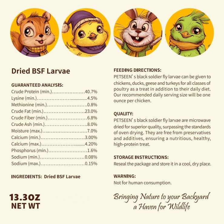 - Natural Source: Dried Black Soldier Fly larvae, a pure and non-GMO protein source for chickens and other poultry.