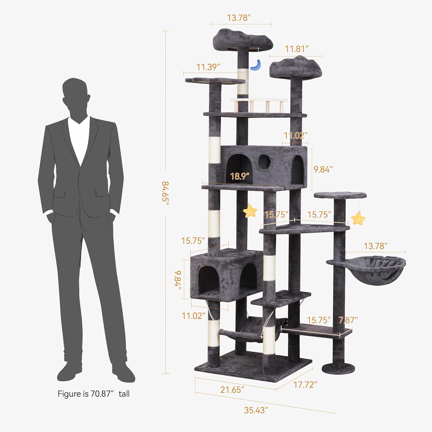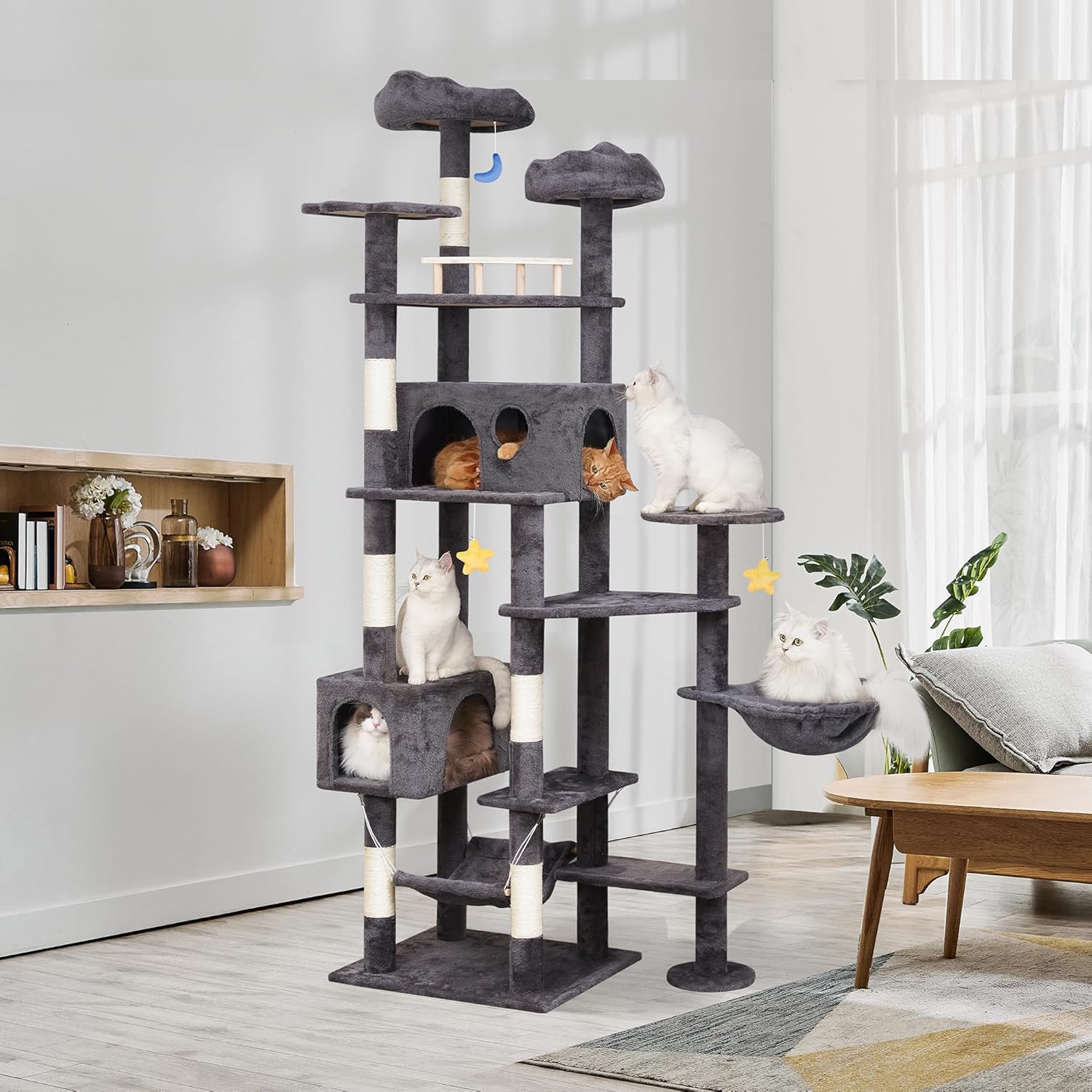 - 【Unique Exterior Design】With its cloud-shaped beds and hanging toys, our tall cat tree adds a touch of whimsy to your home decor. Not only is it functional, but it also serves as a charming centerpiece that will surely make your cats the envy of all their friends