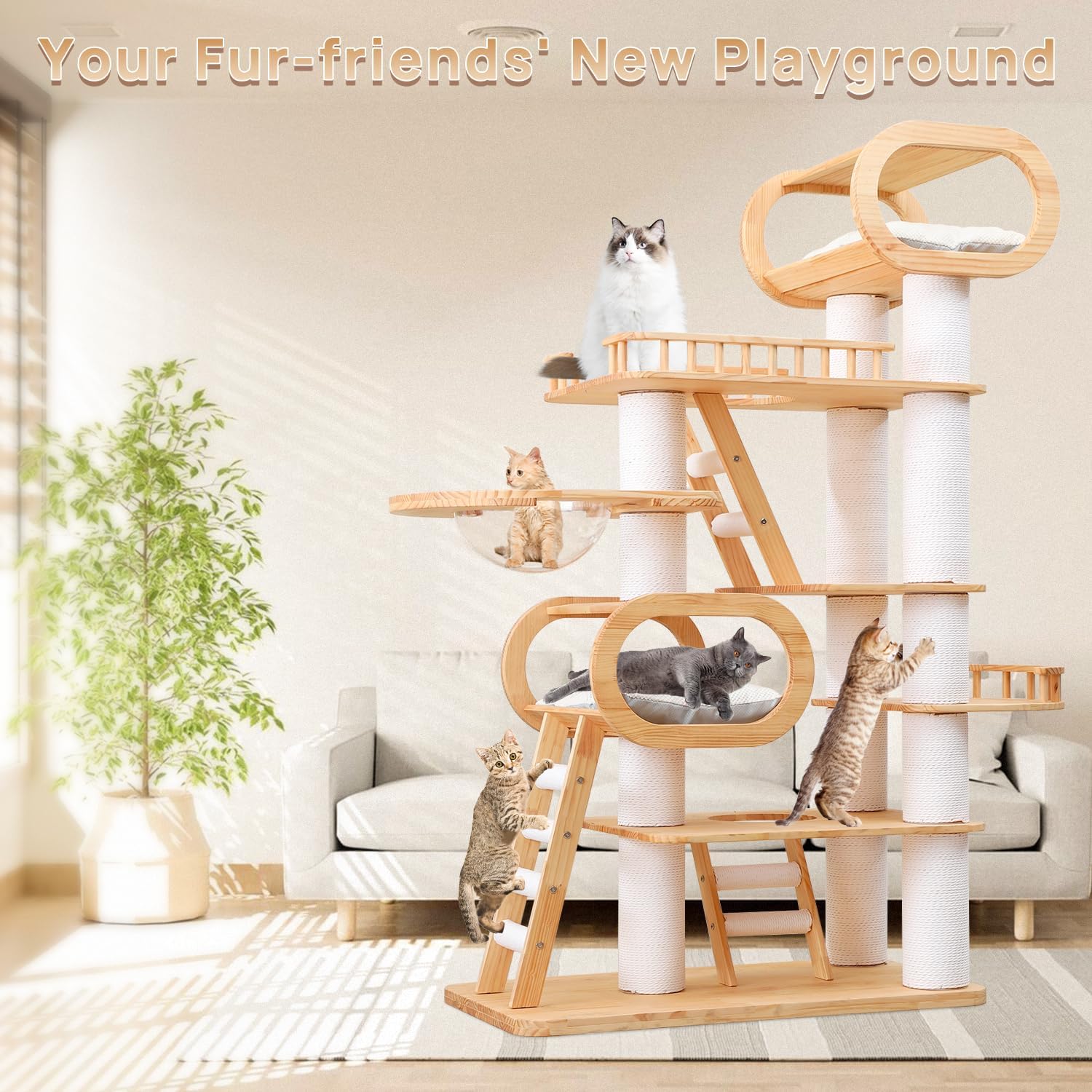 77‘’ Modern Cat Tree, Tall Wood Cat Tower for Indoor Cats Large Adult, Heavy Duty Cat Tree with Scratching Post, Luxury Kitty Condo, Sturdy Cat Furniture with 1 Transparent Bed and 3 Climb Labber