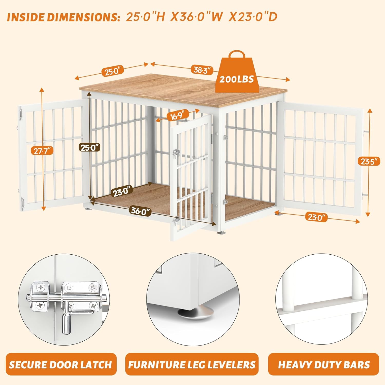 38 Inch Heavy Duty Dog Crate Furniture for Large and Medium Dogs, Decorative Pet House End Table, Wooden Cage Kennel Furniture Indoor, Natural and White