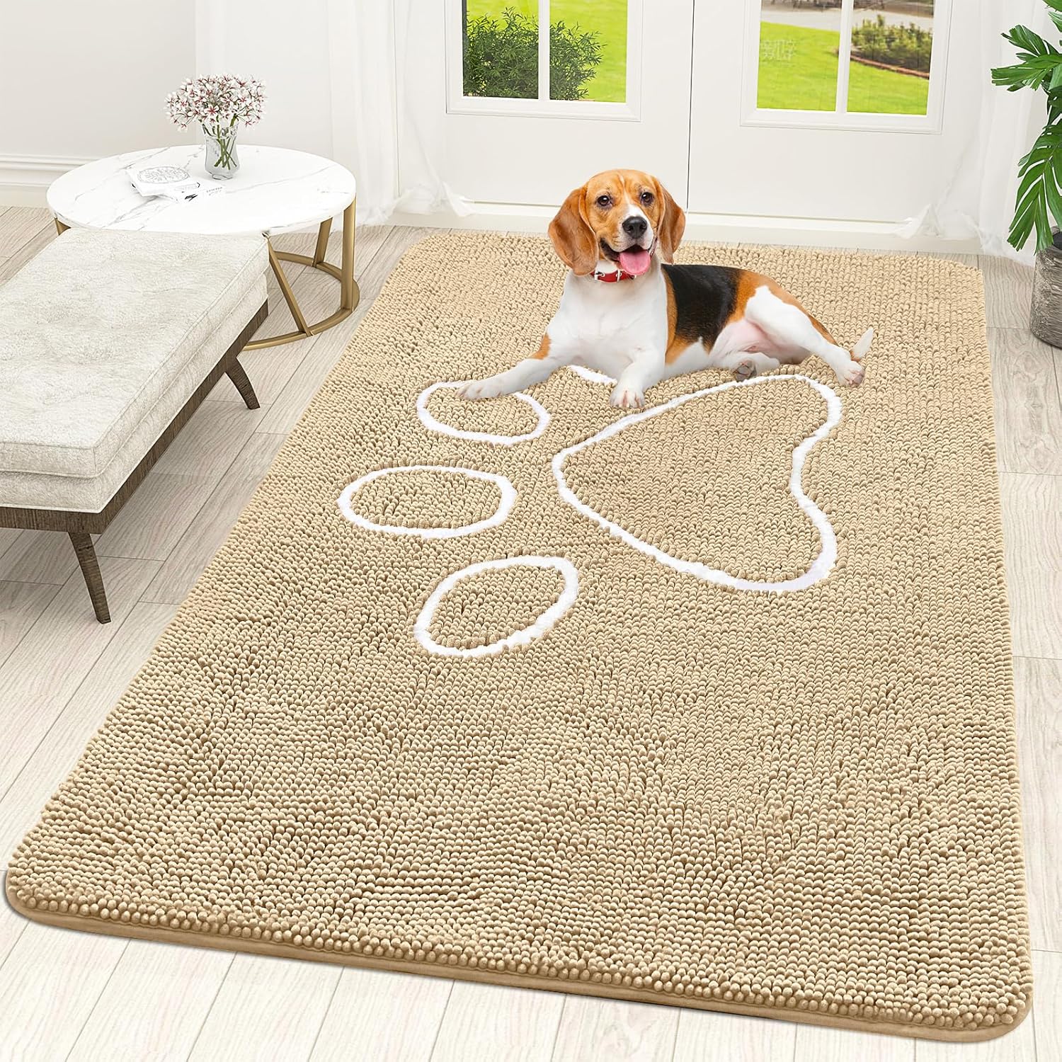 OLANLY Door Mat for Muddy Dog Paws 59x35, Ultra Absorbent Chenille Mud Doormat with Paw Print Design, Non-Slip Washable Doormat for Indoor Entryway, Quick-Dry Pet Bed Mats for Dirty Dogs, Beige