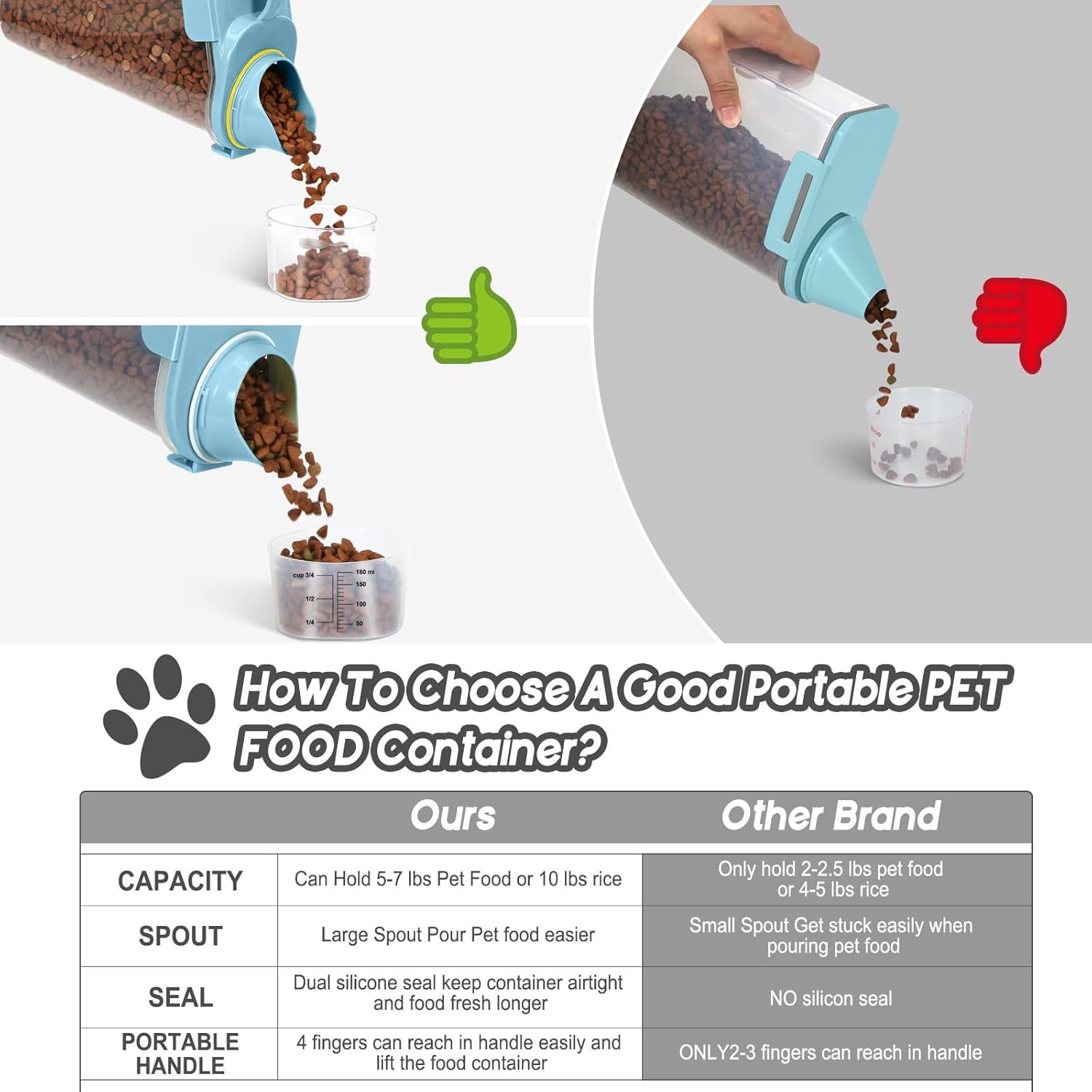 - FUNCTION : This airtight dog food container with portable handle has an airtight design,-has 2 silicone seals and 4 sealing buckles,which can keep your food dry and fresh, the portable handle and large spout design can easily Easily pours food out,also perfect for traveling, hiking, camping or picnicking with your dog