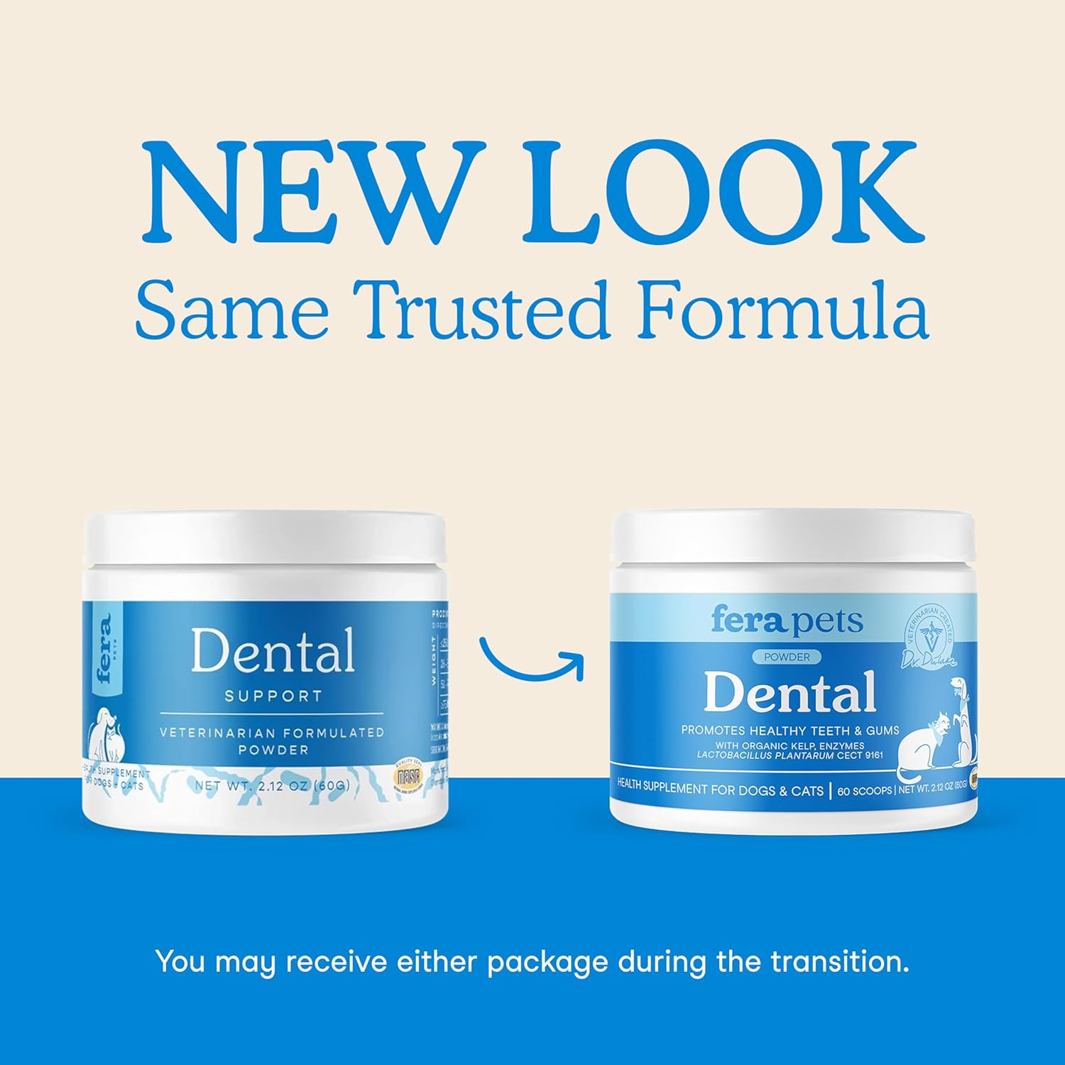 Fera Pets Cat & Dog Dental Support Powder - Supports Fresh Breath - Promotes Healthy Teeth and Gums - Targets Tartar Build-Up - Includes Kelp, Enzymes & Postbiotics - 60 Scoops
