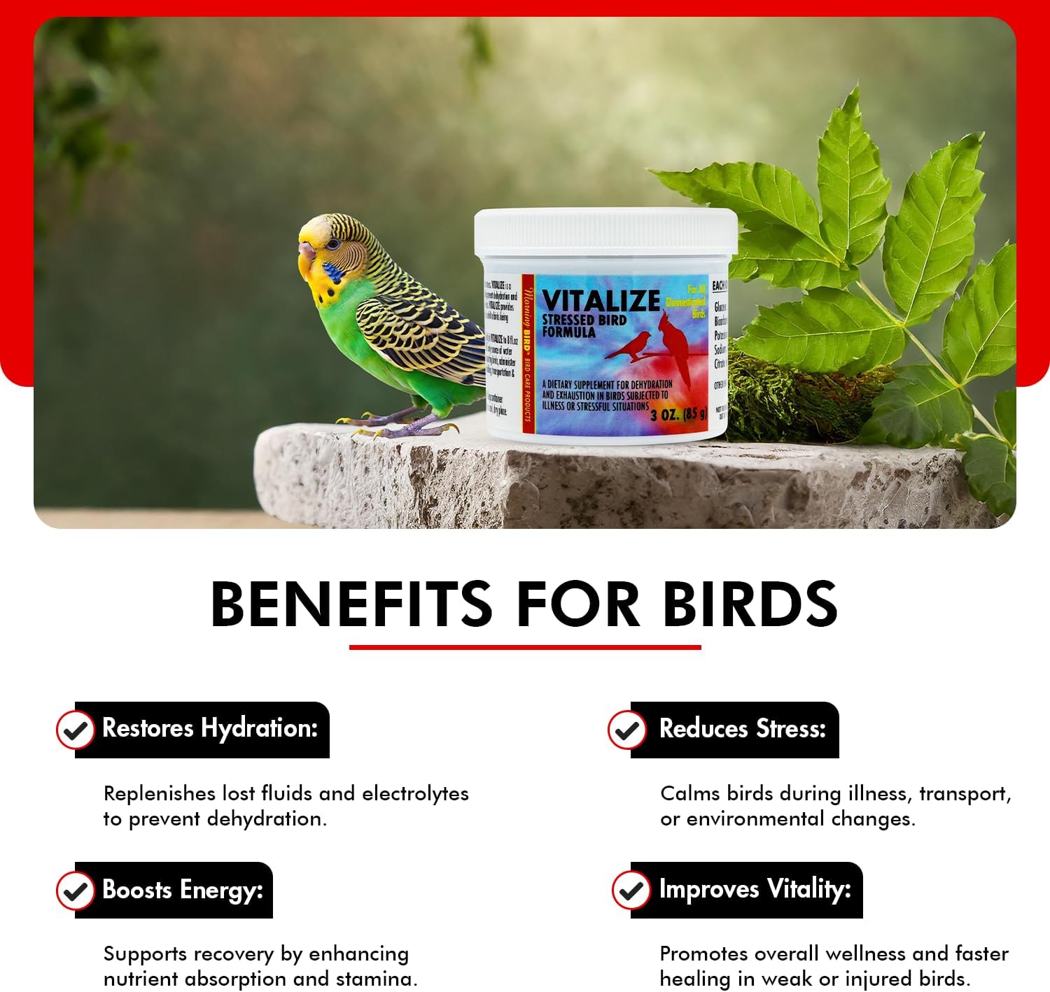 - REDUCES STRESS: Works for birds of all sizes experiencing stress due to exhibition, transport, or relocation; Ideal for moments of high effort and energy expenditure due to illness or injury