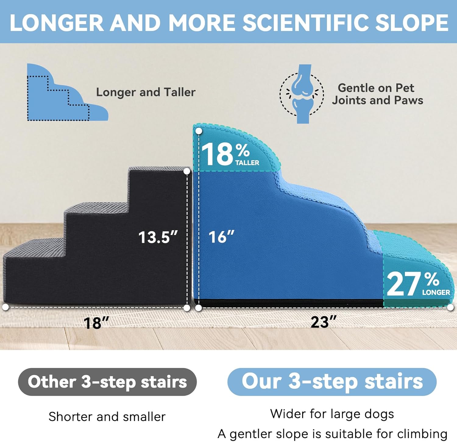 - Specific & Durable Design: Low angle slope design reduces the pressure on joints when pets jump up and down from high bed, sofa, chair and car. Portable handle makes moving stairs easily at home or taking a trip with your pet. The non-slip bottom keeps the stair firmly planted on the ground. No more worrying about your pet slipping and getting hurt! Our foam stair is an essential part of your beloved pet's life! It combines functionality, safety, and durability in one stylish package!