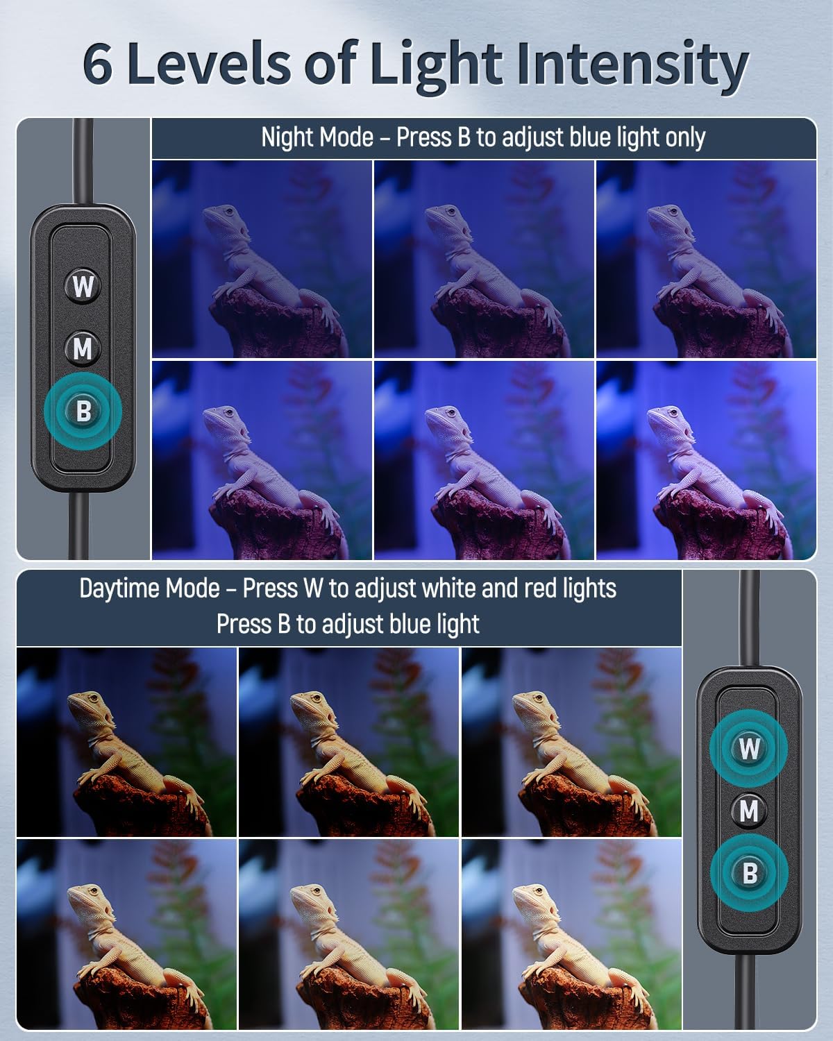 - 2 Lighting Modes: Short press the M button repeatedly on the fish tank light to switch between daytime and night modes. Hold the M button for 3 seconds to turn all lights off. Simulate natural sunrise and sunset to energize your reptiles and give them a sound sleep