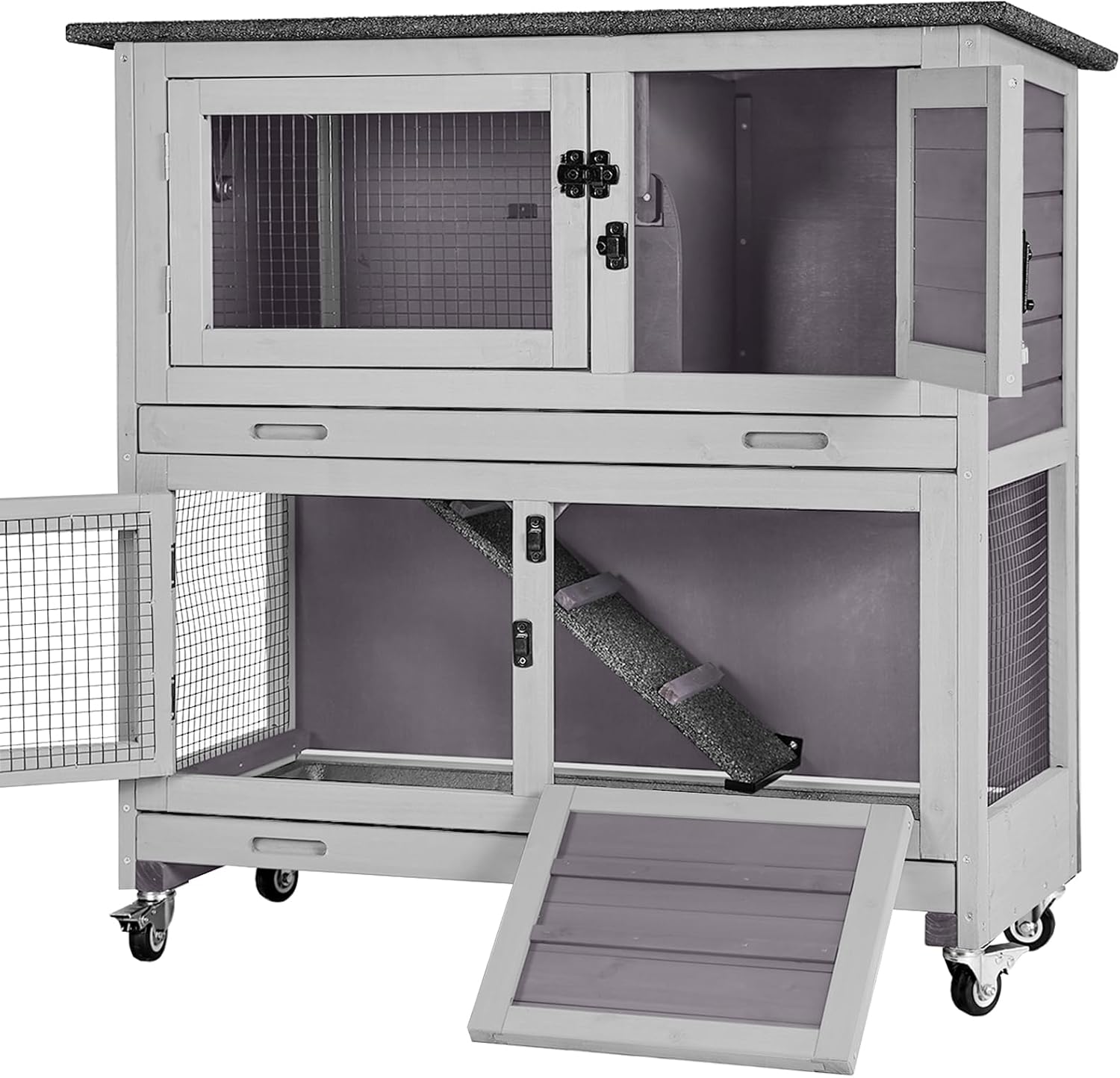 Aivituvin Rabbit Hutch Indoor Bunny Cage Outdoor 2 Story Pet House Guinea Pig Cage on Wheels 36"