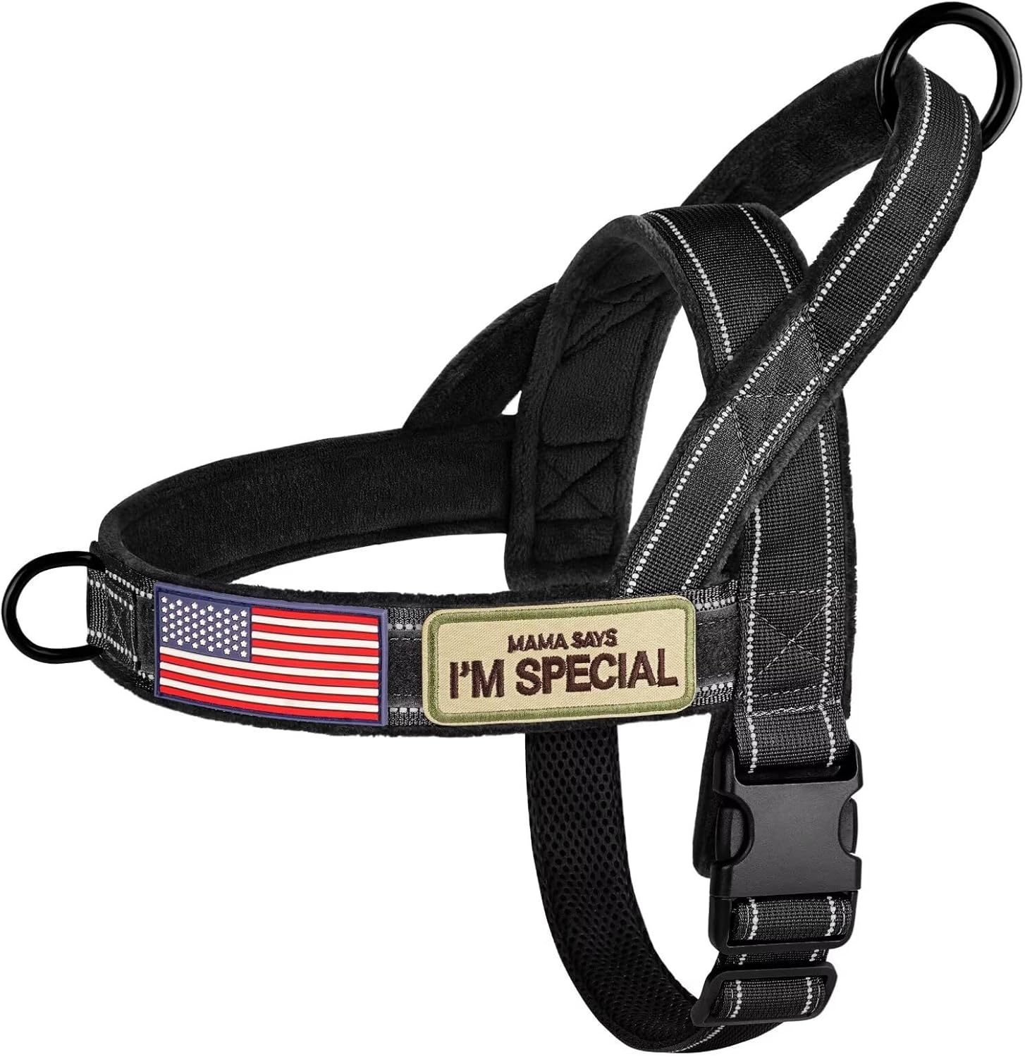 - Swappable Patches: Newly Forestpaw tactical dog harness has a long velcro area,paired with 3 patches, you can put the patches "MAMA SAY I'M SPECIAL" or the flag on it to make your dog more eye-catching and handsome when outdoor training