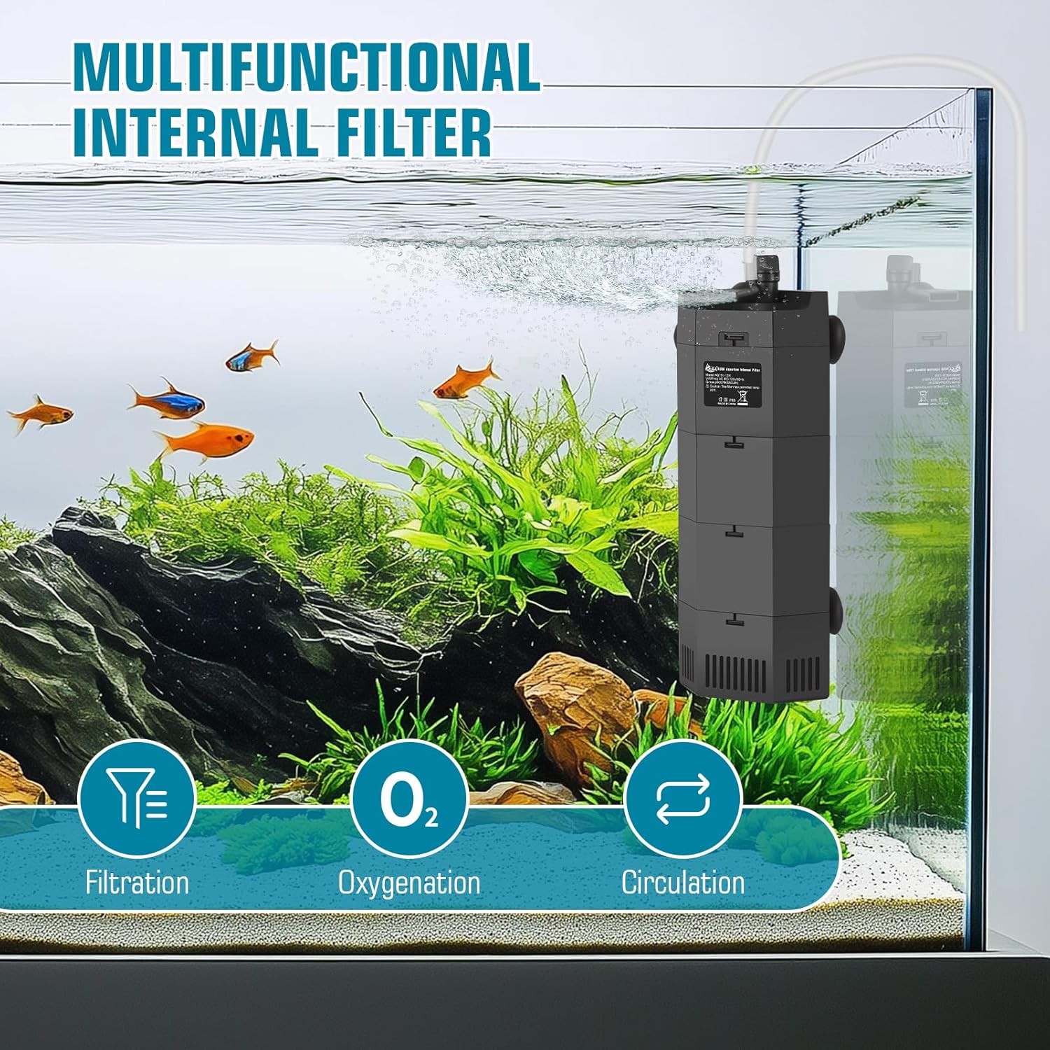 - Powerful Filter with Whisper Operation β Designed with low-noise technology for whisper-quiet performance, this submersible fish tank filter maintains a peaceful environment in bedrooms, offices, or living rooms without disturbing you or your fish.