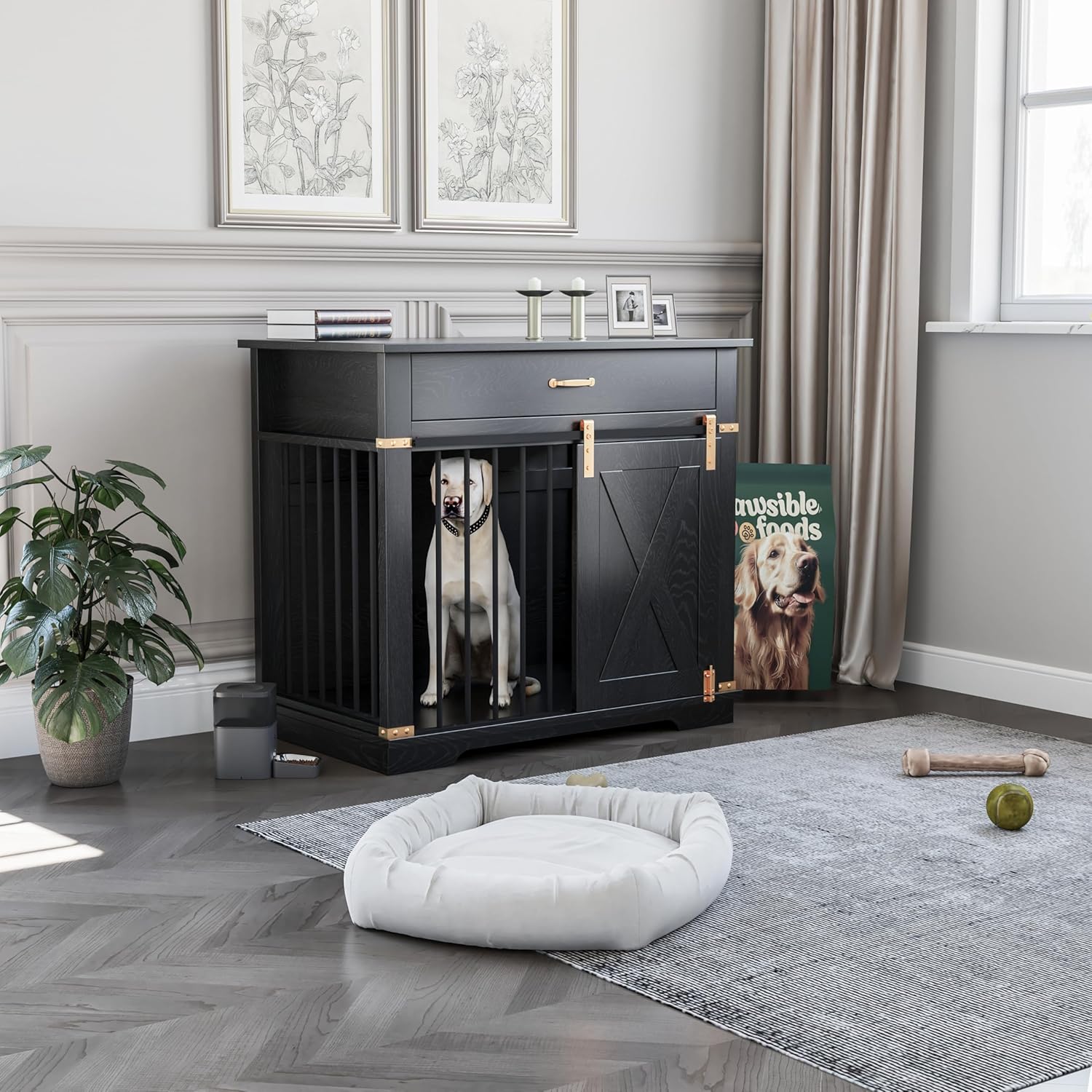 LZUUOB 37.8'' Dog Crate Furniture with Storage Drawer, Decorative Wooden Dog Kennel with Sliding Barn Door, Indoor Water Resistant Cage for Pet, Small, Medium, Large Dog (Black Gold Oak)