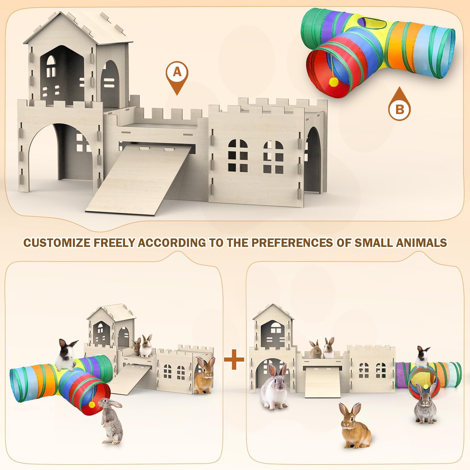 - 【Multi-Functional Bunny House with Expandable Tunnel】:This rabbit hideout comes with a detachable Bunny Tunnel, allowing bunnies to explore freely while owners customize the layout,creating a dynamic habitat for your pet to enjoy.