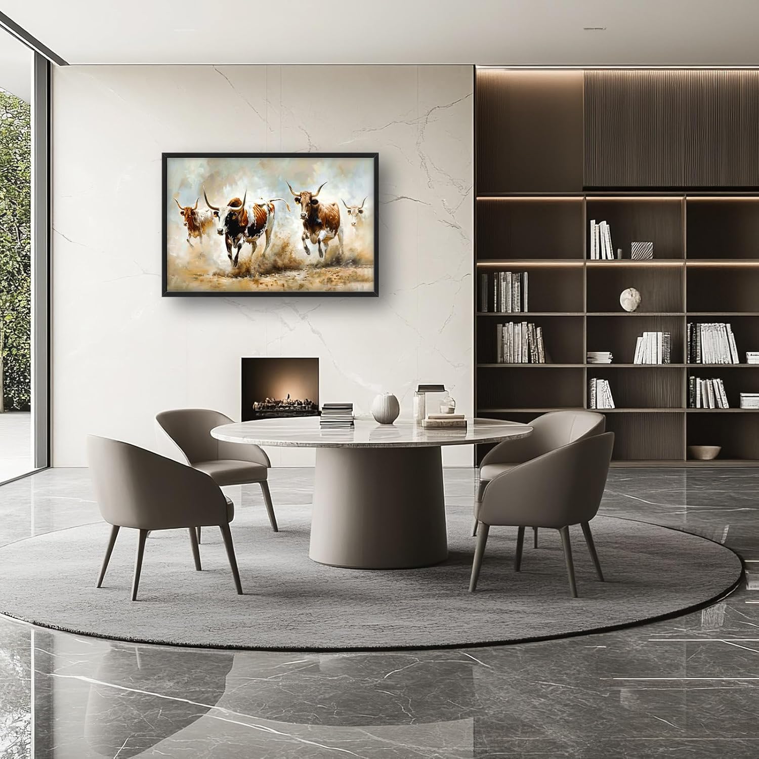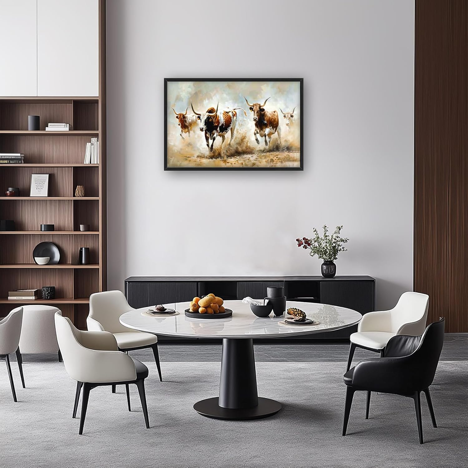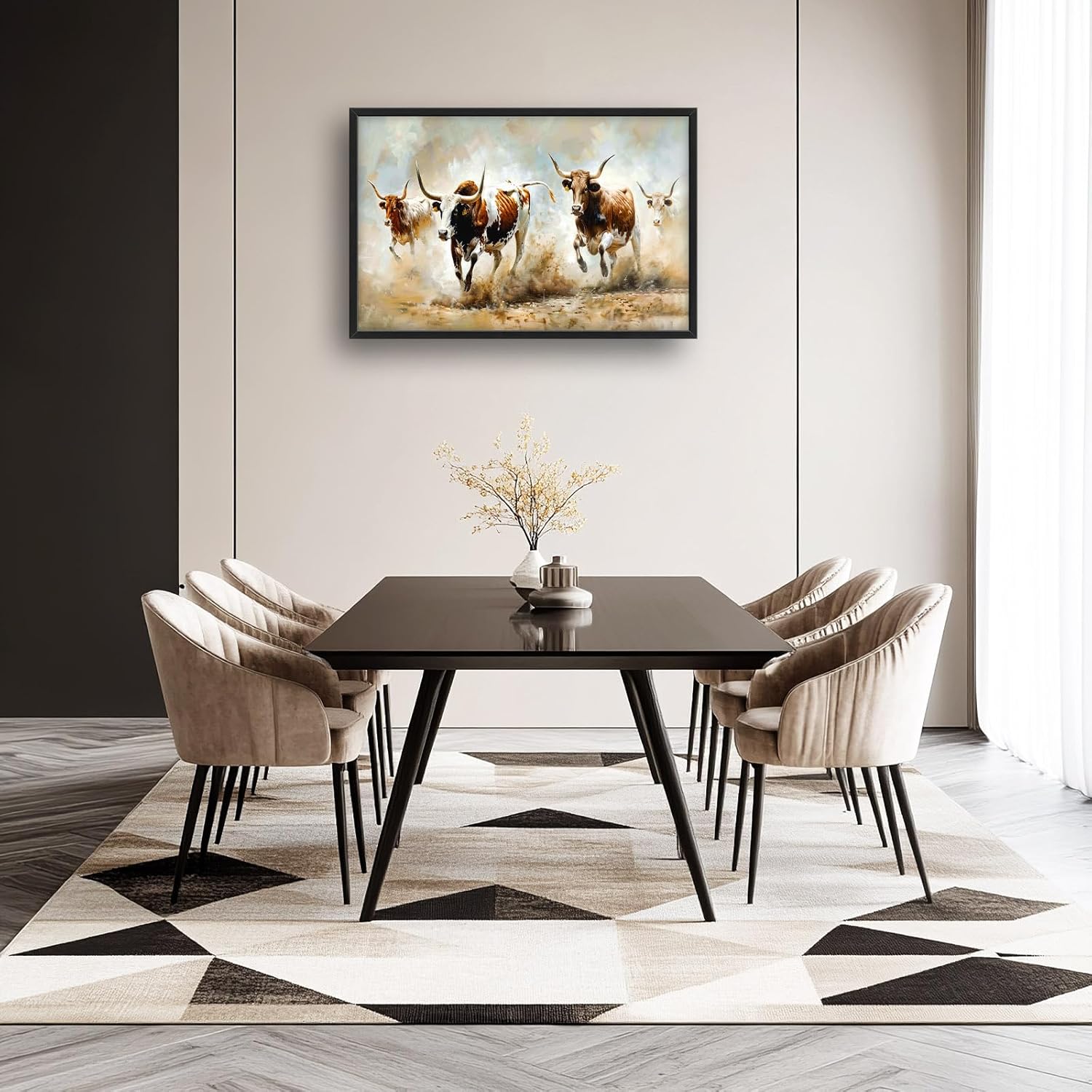 - 【Unique Design】A group of longhorn cattle running through the Texas desert, with detailed brushstrokes capturing their powerful motion and unique features, in an oil painting style with soft colors and dynamic lighting.