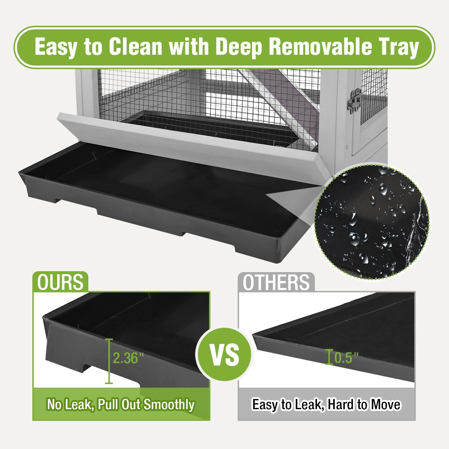 - 【Leaking Proof】🚪Our guinea pig cage is leaking proof; thickened wood design makes the bottom fit the tray more tightly to prevent urine leakage. 2.35" deeper tray provides ample room for bedding. Pull out freely from back and forth, easy to clean and give your pets a healthy life. Suitable for indoor and outdoor use.