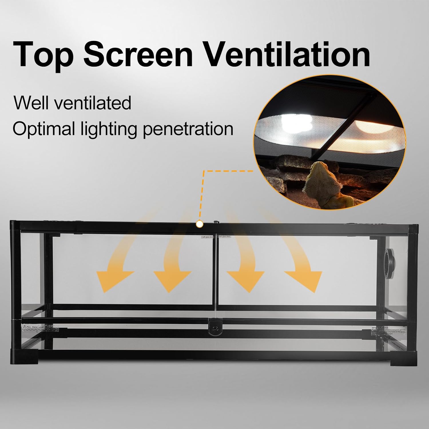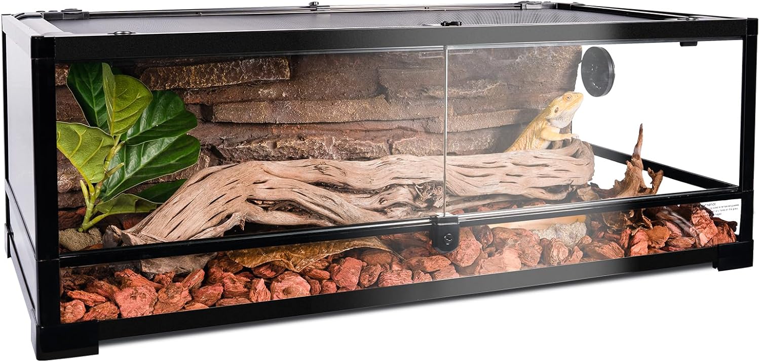 - Premium & Durable Construction: Featuring tempered glass on all four sides and aluminum alloy frame, iron mesh top, this terrarium delivers exceptional durability. Provides crystal-clear, uninterrupted viewing from every angle โ an essential component for reptile habitat