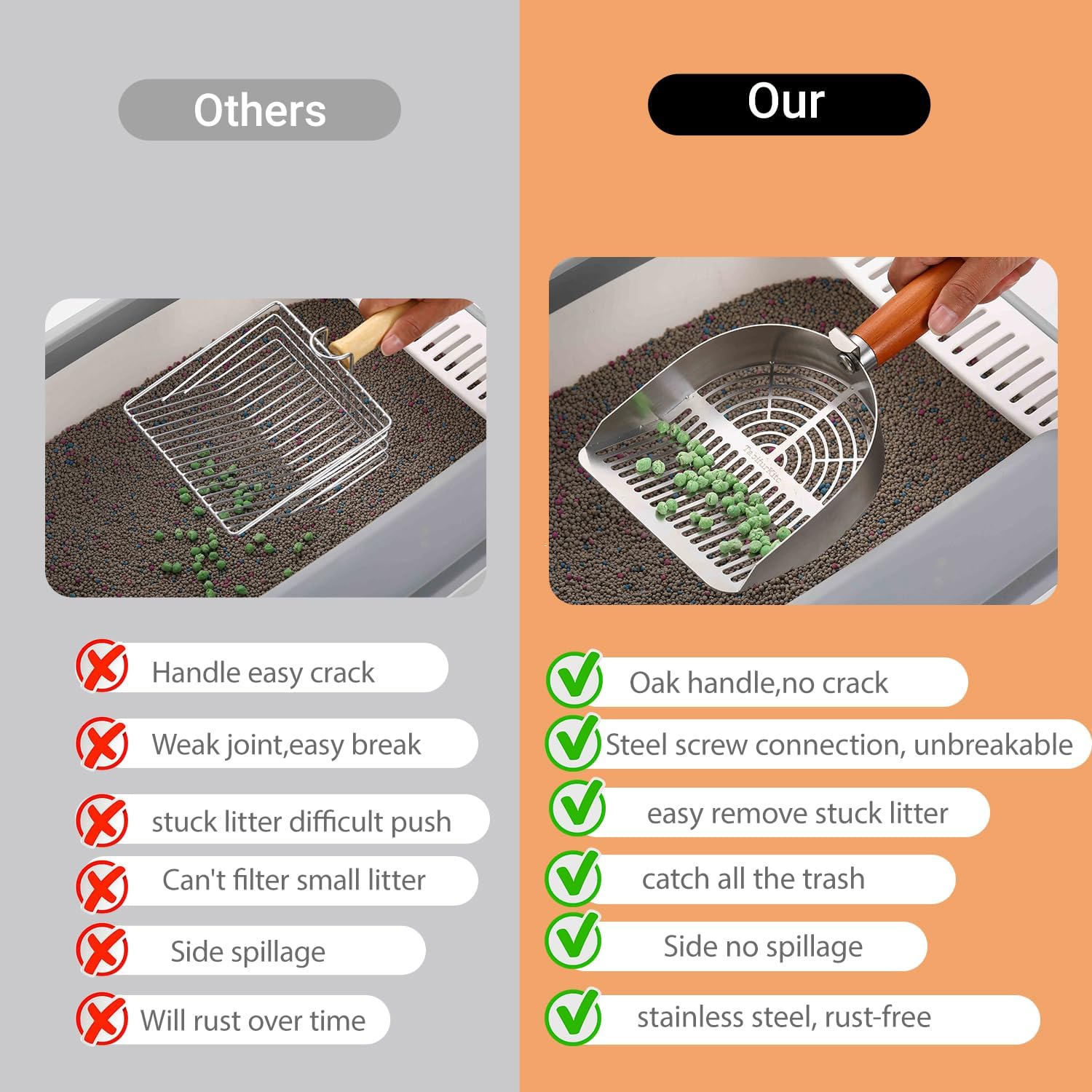 - [Long Oak Handle – Comfortable and Reliable Grip] The oak handle has been extended from 12.5cm to 15.5cm for improved comfort and reach. It’s securely fastened with metal screws to ensure long-term stability. This long handle cat litter scoop won’t loosen or break—ideal for daily use. Say goodbye to flimsy cat scooper handles that fail when you need them most.