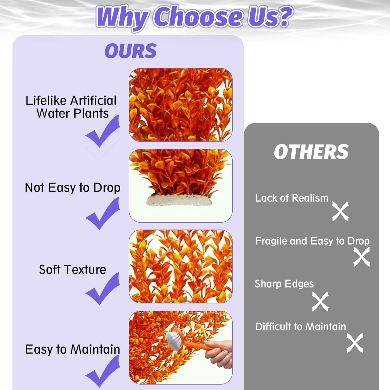 - RELIABLE MATERIAL : Our fake water plant leaves and roots are made of soft plastic material that won't affect the water quality. The leaves do not have sharp edges and have a soft texture, which can effectively avoid any physical damage to the fish while swimming or playing, and can better beautify the e-nvironment, maintain stability and not fade. Provide a comfortable and clean living e-nvironment for fish. Whether placed in a saltwater e-nvironment or freshwater e-nvironment, it can be perfectly adapted