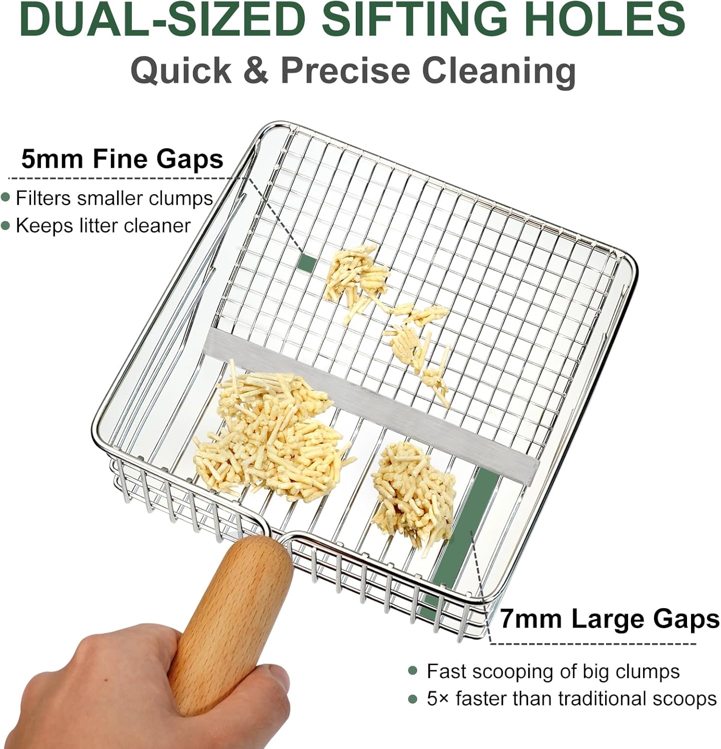 - One Scoop for Two Purposes, Faster Sifting: This metal cat litter scoop features a fine grid design at the front end to capture fine particles and cat waste accurately, while the wide-slit design at the back end easily scoops up larger waste pieces. This allows for efficient cleaning and recycling. Itโs a nice cat scooper for litter box