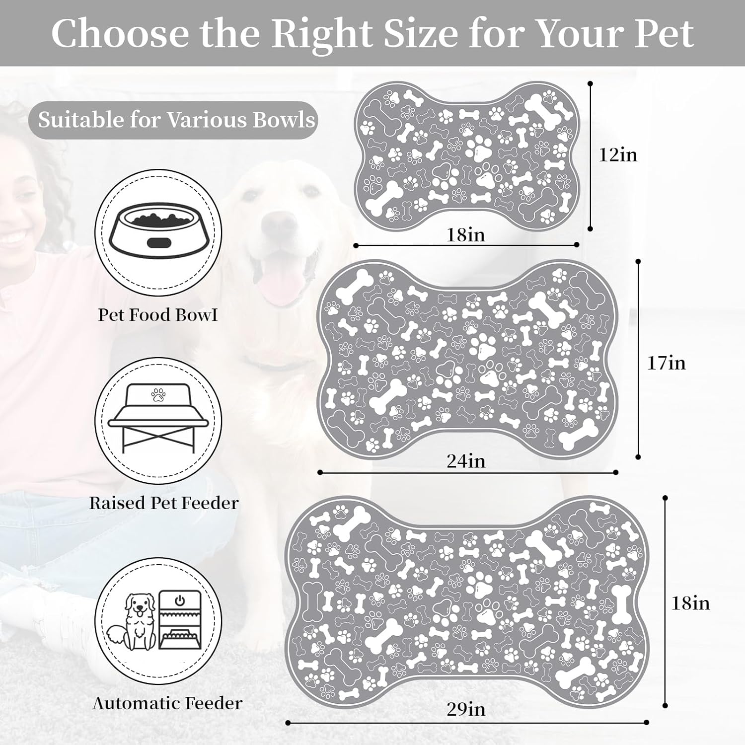 - CUTE AND FASHIONABLE DESIGN: Our pet feeding mats are designed with dog paw and bone motifs, very interesting. It is available in a variety of colors, sizes and shapes to provide a unique dedicated space for your pet's food and water bowls, and you can choose a style that matches your home dรฉcor.