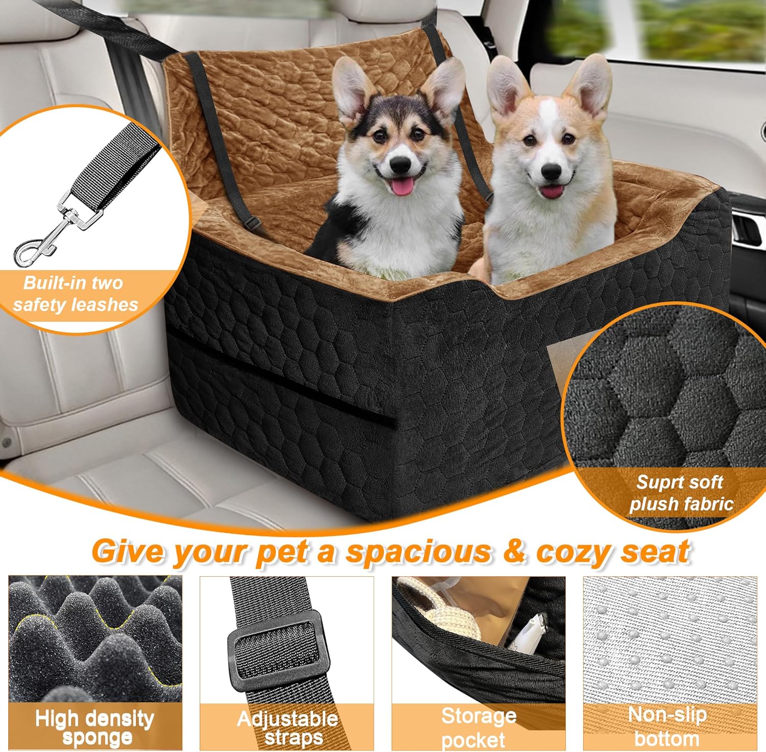 Dog Car Seat for Small/Medium Dogs, Memory Foam Dog Booster Seat, Travel Safety Per Car Seat with Washable Removable Cover, Storage Pockets for Dogs up to 35 lbs(BlackBrown)