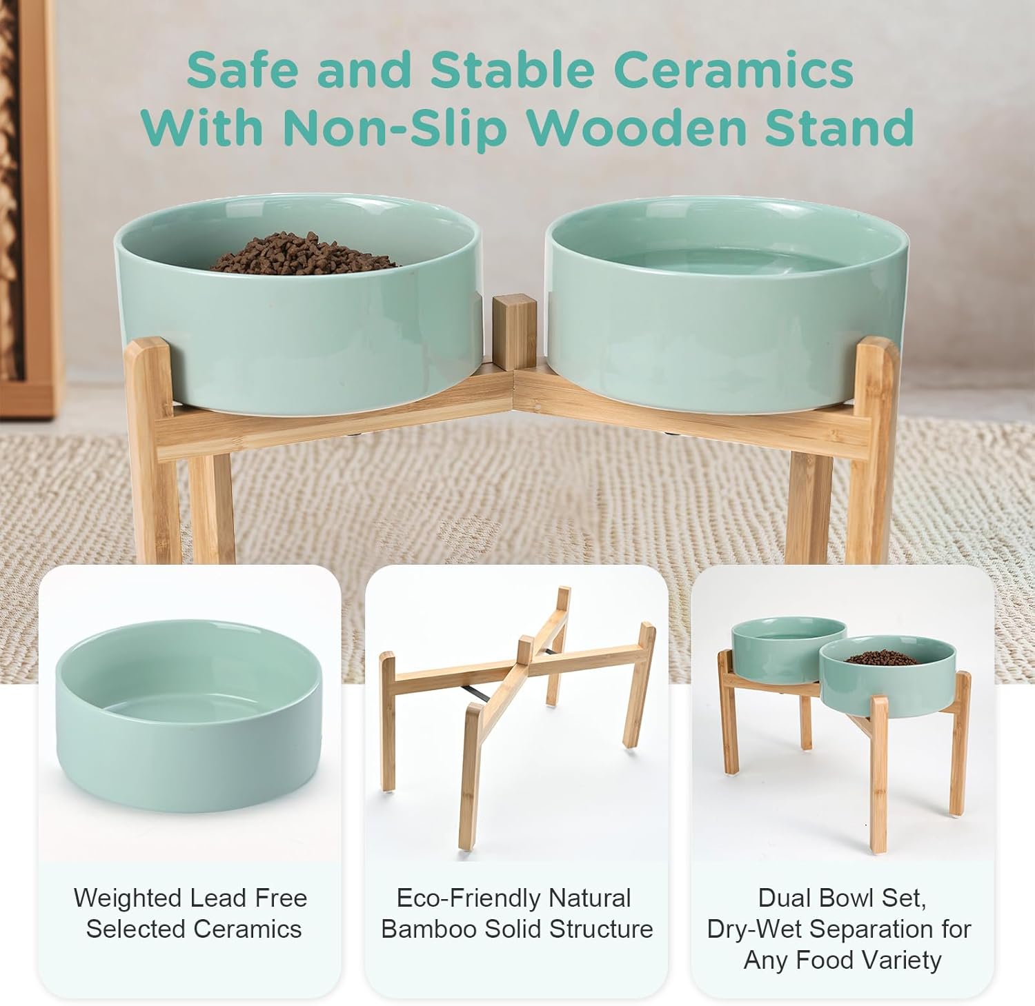 SPUNKYJUNKY Elevated Dog Bowls Ceramic, 8.3'' Dogs Food Water Bowls Raised with Non-Slip Bamboo Stand for Large Sized Breed Microwave Dishwasher Safe - 60 OZ,Light Green