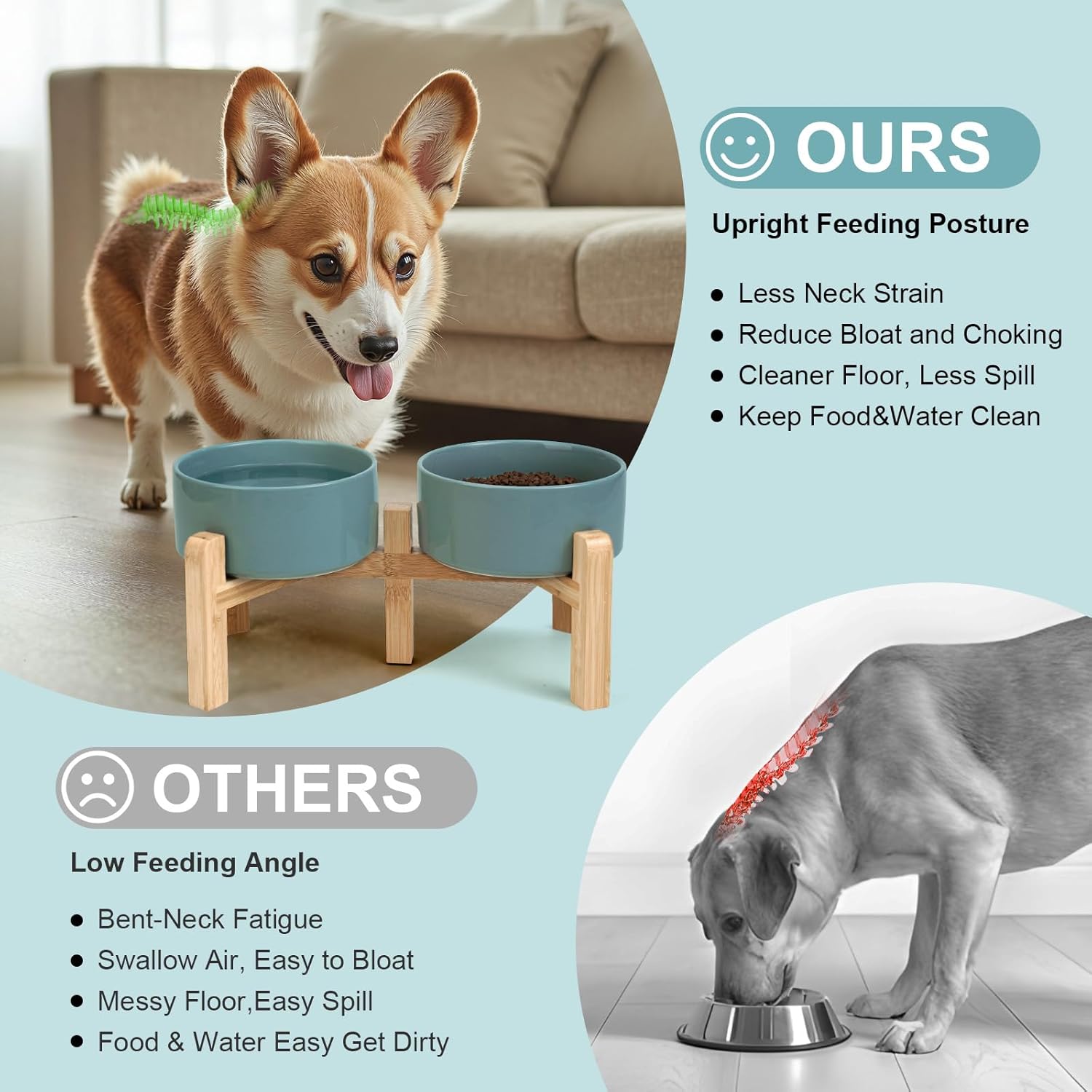 - Adjustable Bamboo Stand for Healthier Posture – Transform the set into true elevated dog bowls by choosing either of two height settings; the raised position helps dogs and cats eat in a more natural alignment, which can ease neck pressure and support smoother swallowing—ideal for pets prone to gulping, minor regurgitation, or digestive discomfort