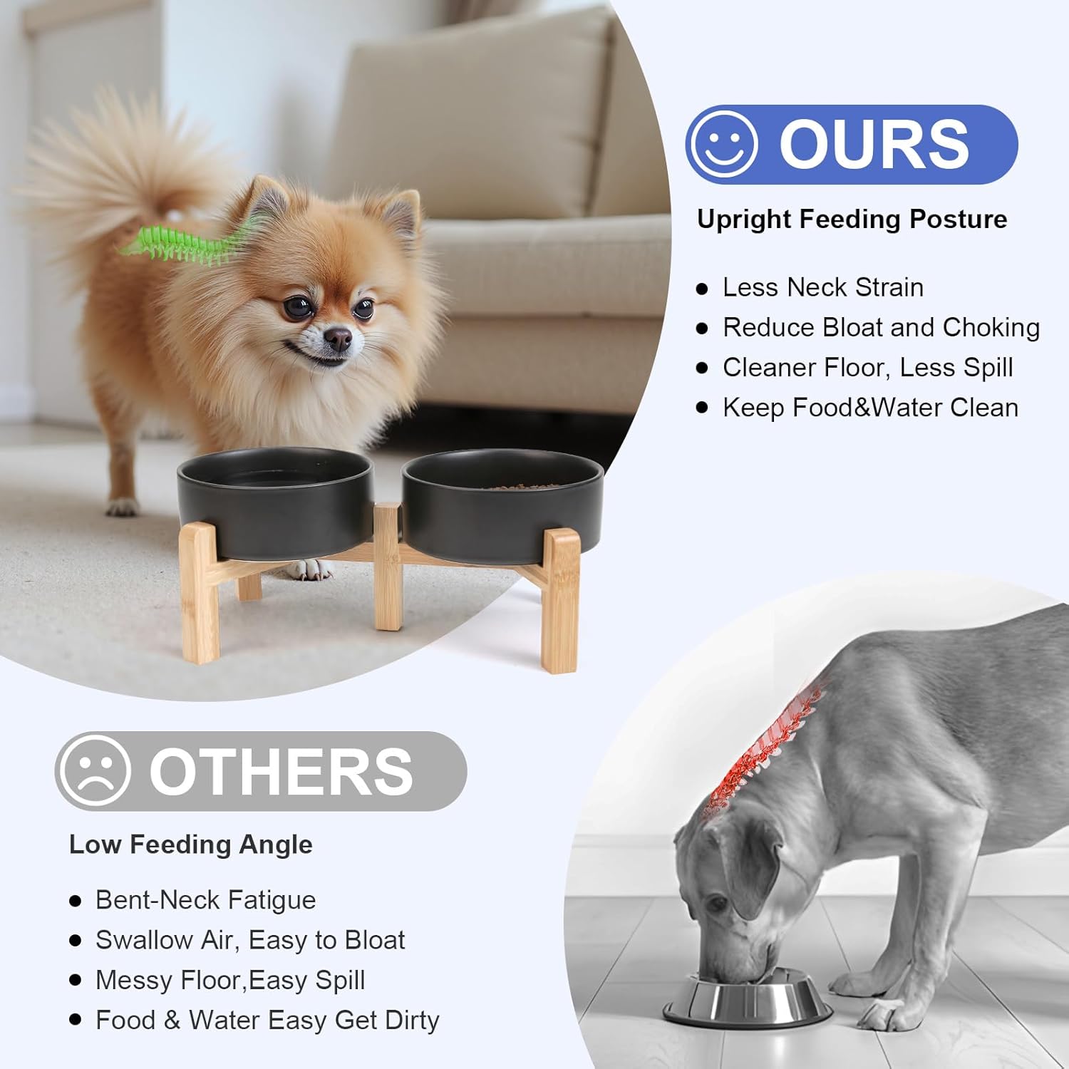 - Adjustable Bamboo Stand for Healthier Posture – Transform the set into true elevated dog bowls by choosing either of two height settings; the raised position helps dogs and cats eat in a more natural alignment, which can ease neck pressure and support smoother swallowing—ideal for pets prone to gulping, minor regurgitation, or digestive discomfort