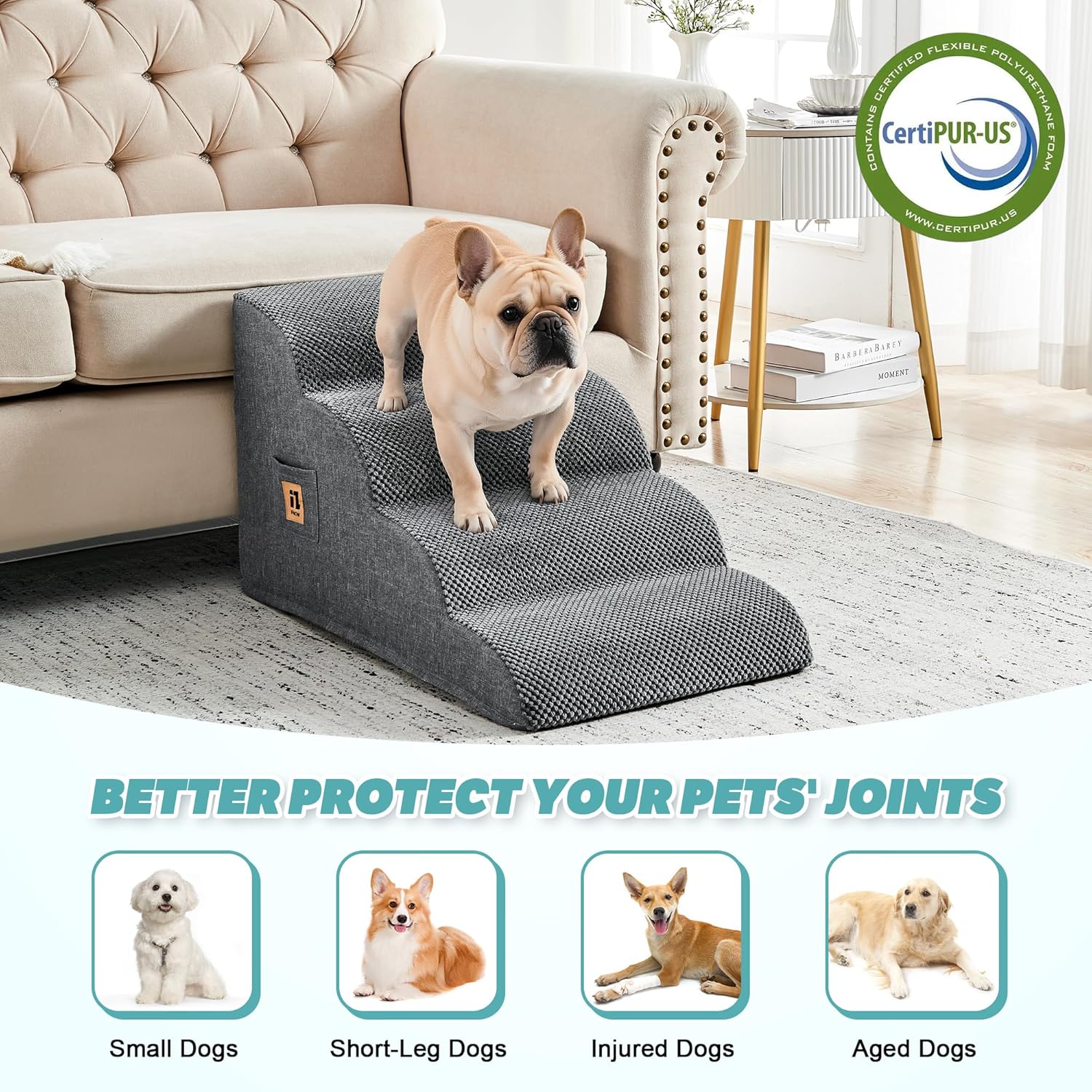 - WARM NOTICE: The dog steps for couch are vacuum compressed and packaged. No assembly is required after arrival. Just open the package and wait for 24-48 hours for the sponge to fully expand and fill the cover before use. Note that the dog steps for bed are not suitable for large dogs.The 3 step stair is suitable for chairs and low sofas, the 4 step stair is suitable for chairs, sofas and beds, and the 5 step stair is suitable for beds and windowsill.