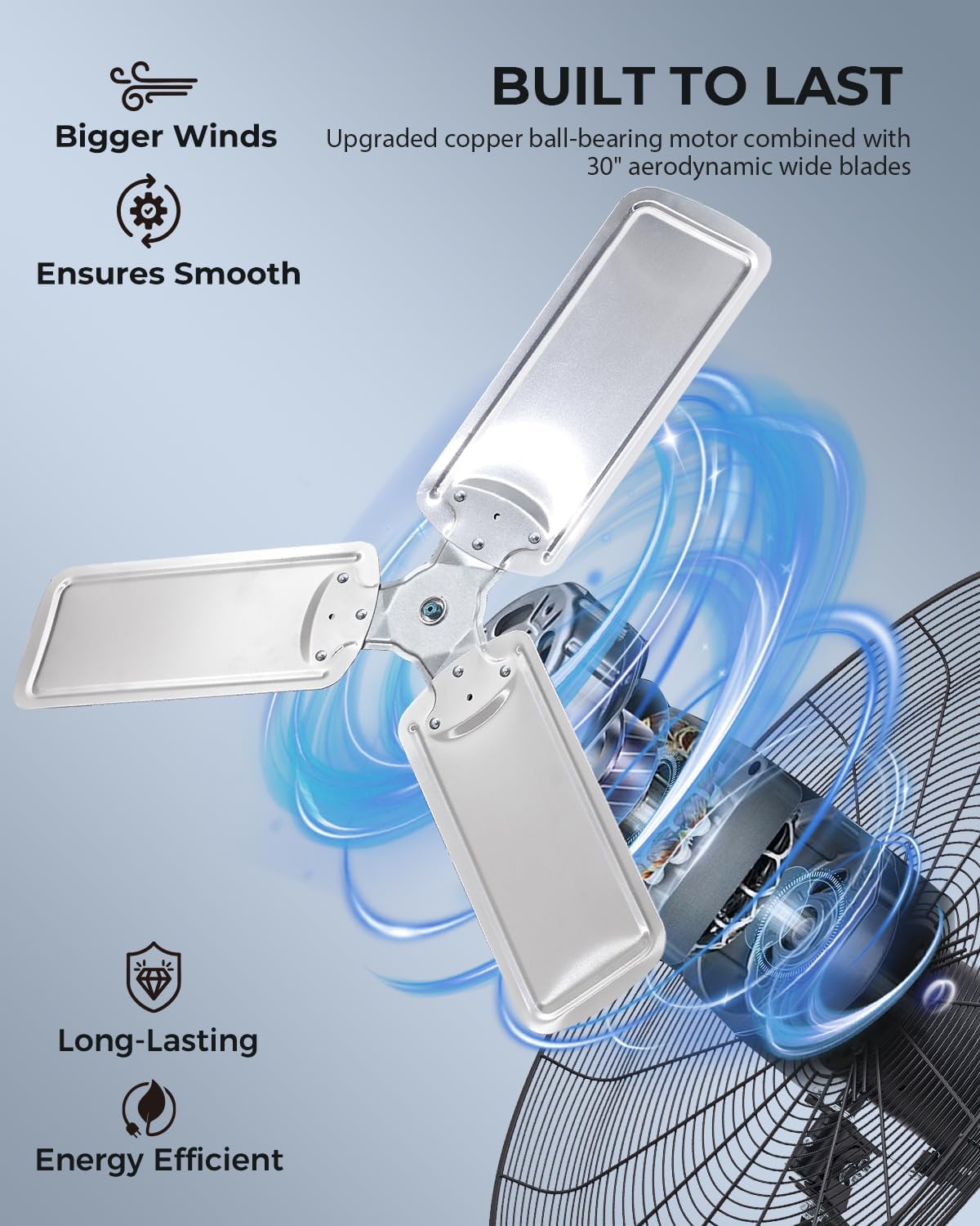 - Durable & Low-Noise: Our wall mounted fan is equipped with upgraded copper ball-bearing motor and 30" aerodynamic wide blades to a farther air movement range at lower noise. Designed for safety and reliability, industrial wall fan includes an OSHA compliant protective grille, a 9.8 ft grounded 3-prong power cord, powder-coated steel construction, and built-in overheating protection, making it the ideal cooling solution for demanding environments.