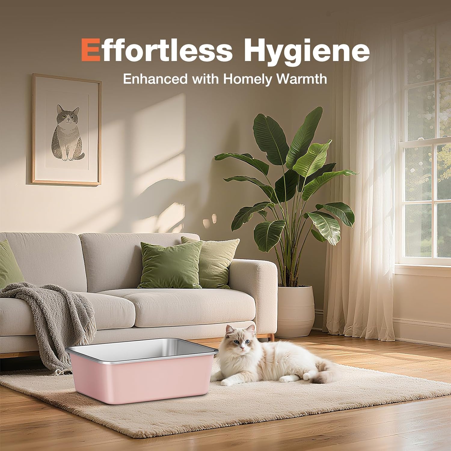 Stainless Steel Litter Box, Large Metal Cat Litter Box with High Sided for Big and Small Cats, Non-Stick, Easy to Clean, Odor-Free, 23.4" L×15.6" W×5.9" H, Blush Pink