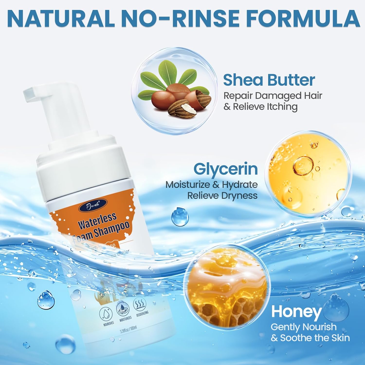 - The term "Waterless" in Waterless Shampoo doesn't mean that there is no water in the product's formula. Instead, it refers to the convenience that after applying this shampoo, there is no need to rinse your petโs fur with water. Compared to regular pet shampoos, which usually require thorough rinsing, our Waterless Shampoo saves you time and effort, making the grooming process simpler and more efficient.