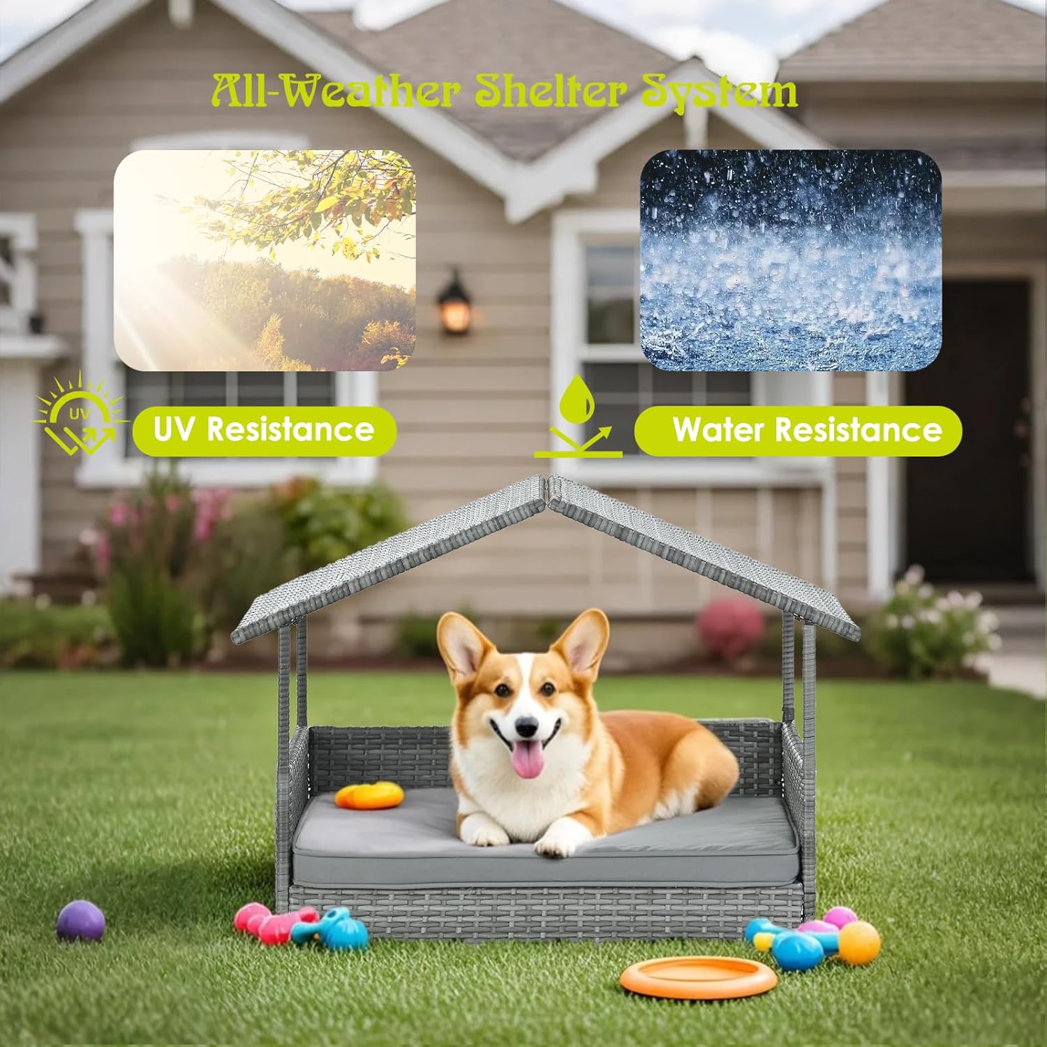 Wicker Dog House Outdoor Indoor with Canopy, Elevated Dog Shelter & Dog Bed with Light Gray Cushion, Water-Resistant Raised Pet House for Small Medium Dogs, Rattan Dog Cot for Deck, Patio, Yard, Pool