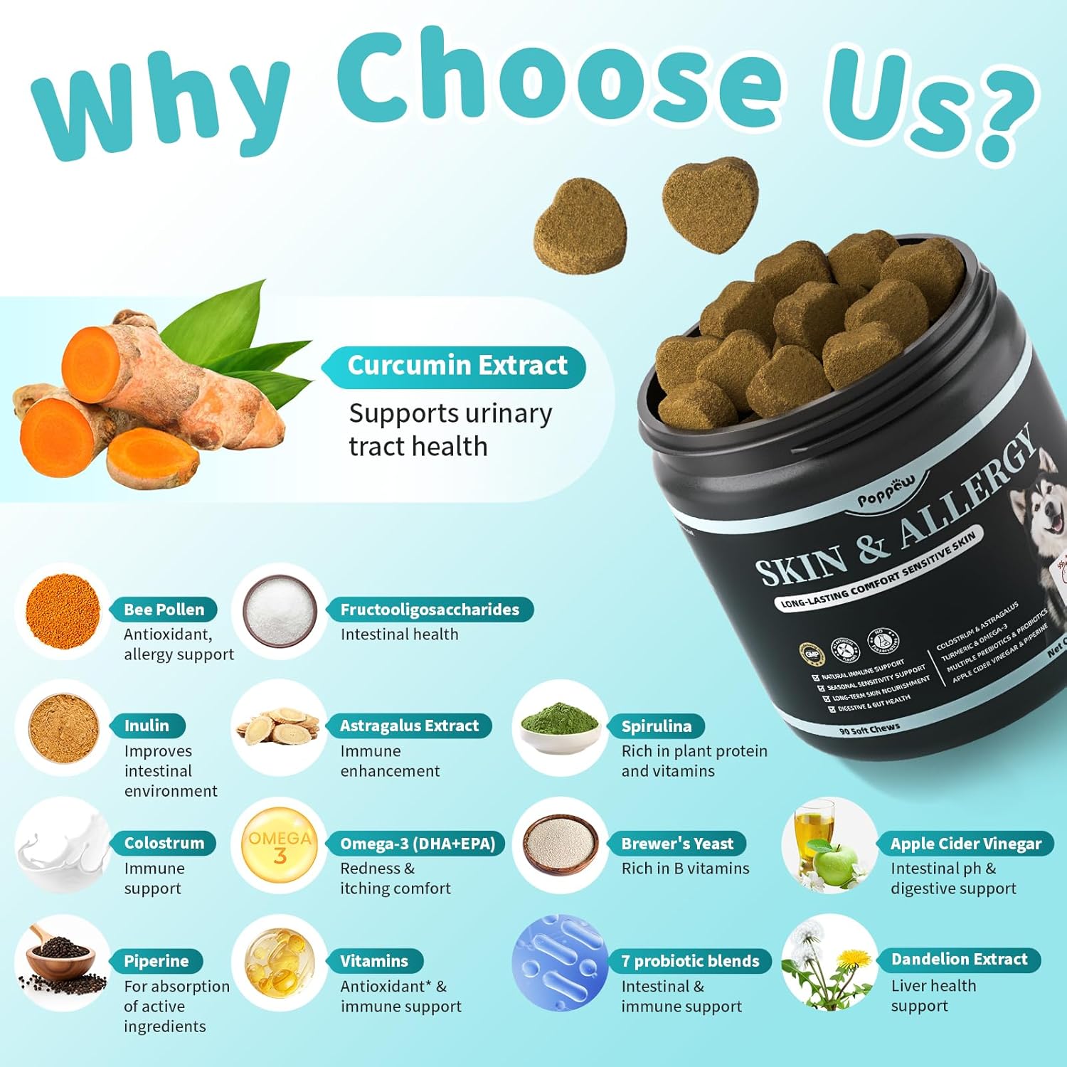 - Natural Immune Support: Our dog allergy chews are formulated with a powerful blend of colostrum and astragalus. These advanced dog allergy supplements provide robust support for your dog's immune system. The addition of turmeric and omega-3 rich fish & flaxseed oil helps your dog maintain a response health to seasonal and environmental sensitivities