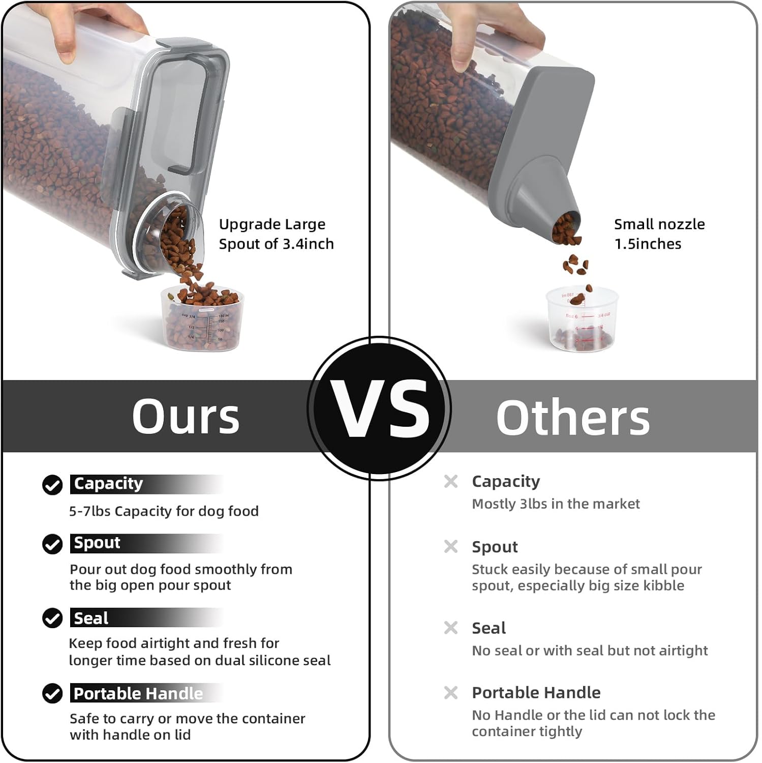 - WHAT YOU GET?:The small dog food bin comes with a 1-pack airtight pet food storage container with a clear measuring cup and an upgraded large spout for easy pouring of pet food at any time. This dog food storage containers can be a gift The perfect gift for any home.