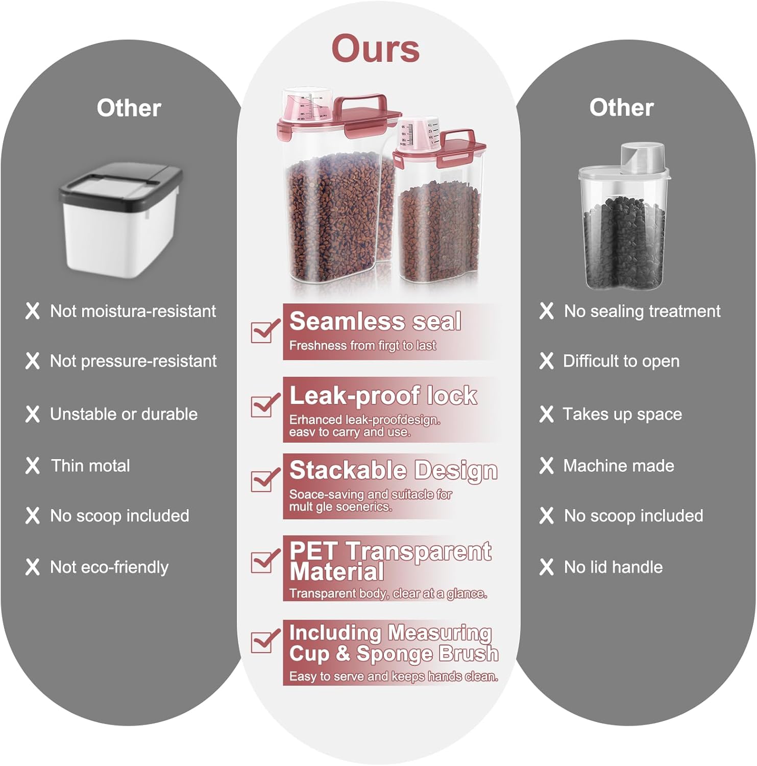 - BENEFITS : Upgraded Large Pour Spout with Measuring Cup-We upgraded the mold so that the pour spout is large enough to pour out large dog food.You can now pour food easily and quickly.The newly upgraded measuring cup can now also be easily screwed onto the nozzle