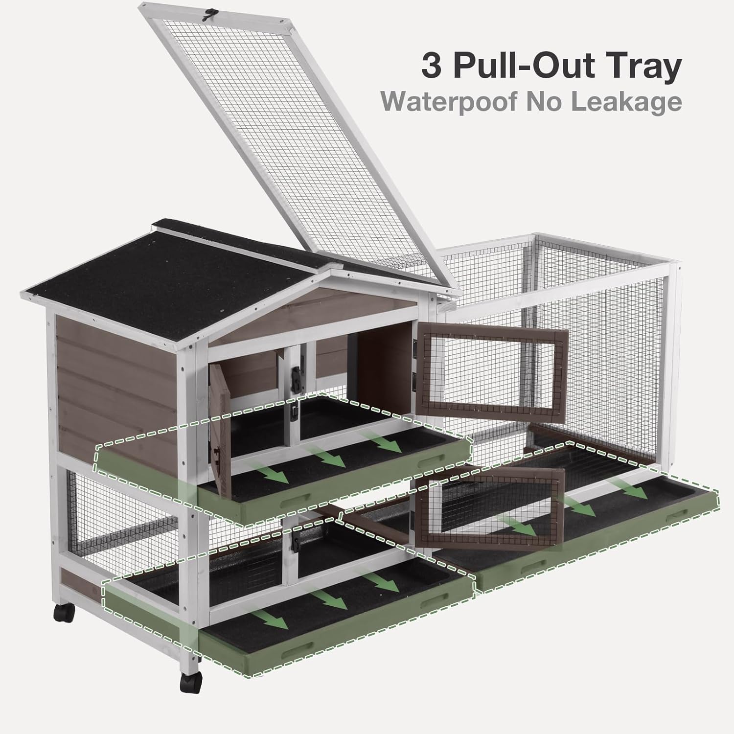 2-Story Indoor Rabbit Hutch with Chew-Proof Outdoor Rabbit Cage with 6 Locking Casters Bunny Cage 2 Pull-Out Trays Guinea Pigs Cage 62" Brown