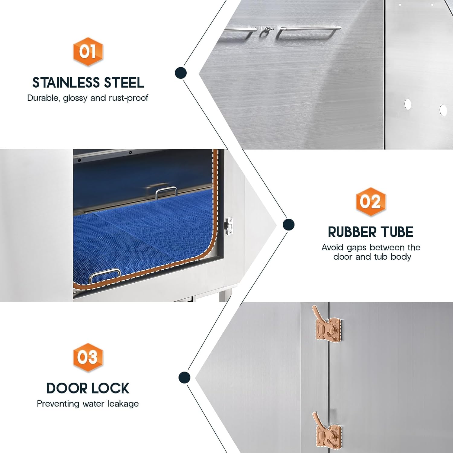 - Leak-proof Design: This 60-inch dog wash station fits pets of various sizes. Seamless welding, a reinforced rubber tube, and secure door locks work together to prevent leakage and pet escapes.