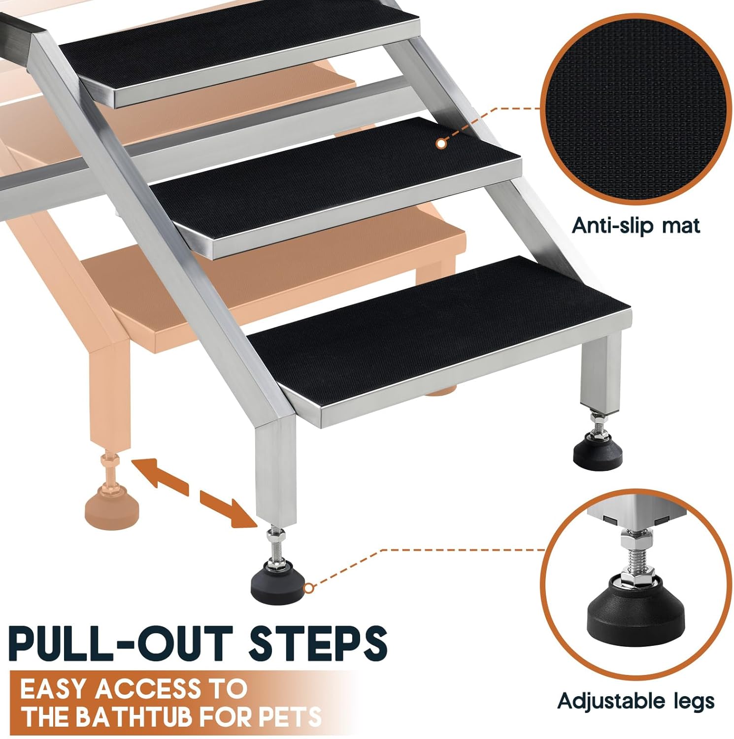 - Removable Drainage Board: The pet bathtub includes a height-adjustable and removable drain board that supports up to 550 lbs, providing safe grooming for pets of different sizes. Anti-slip pads add extra stability.